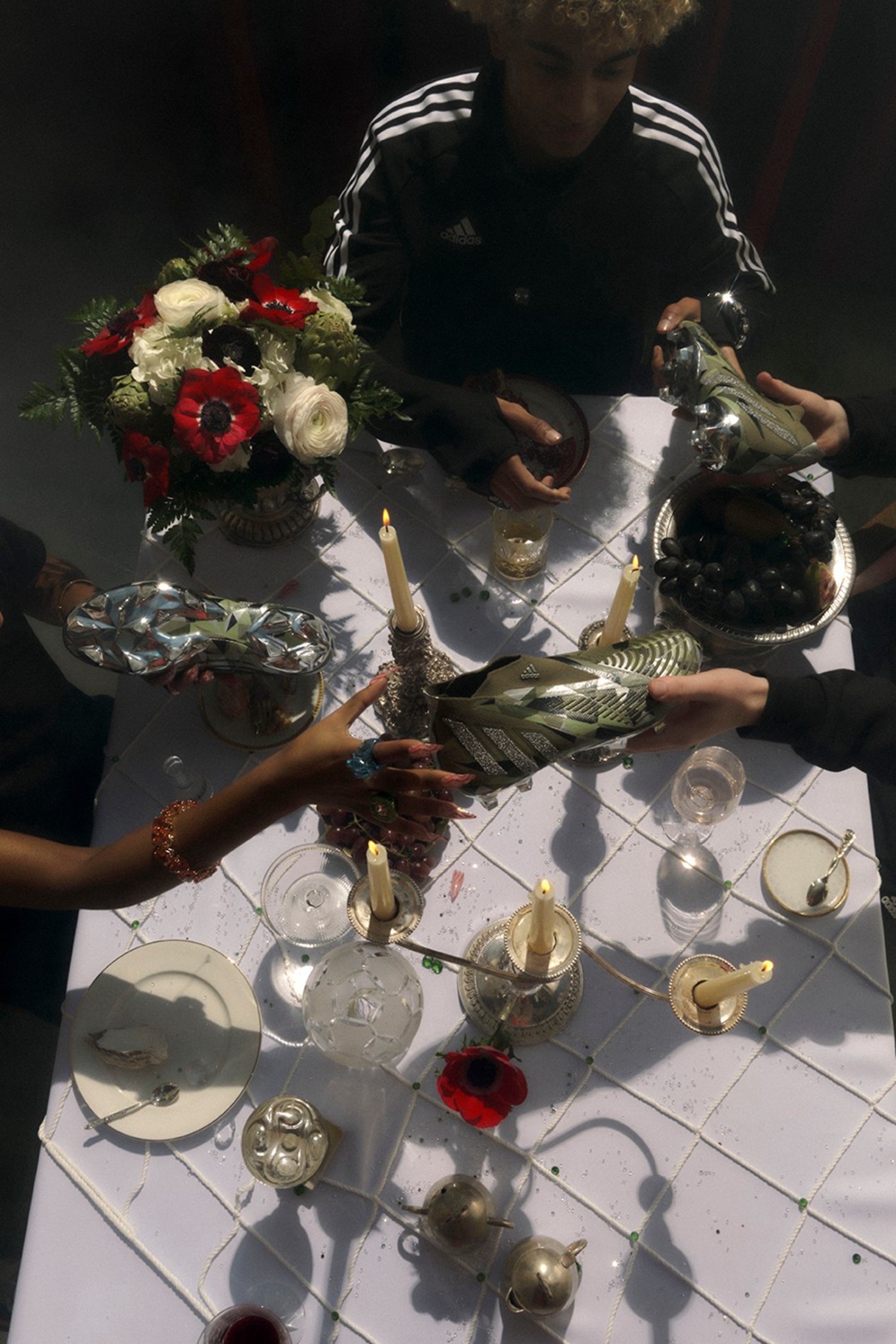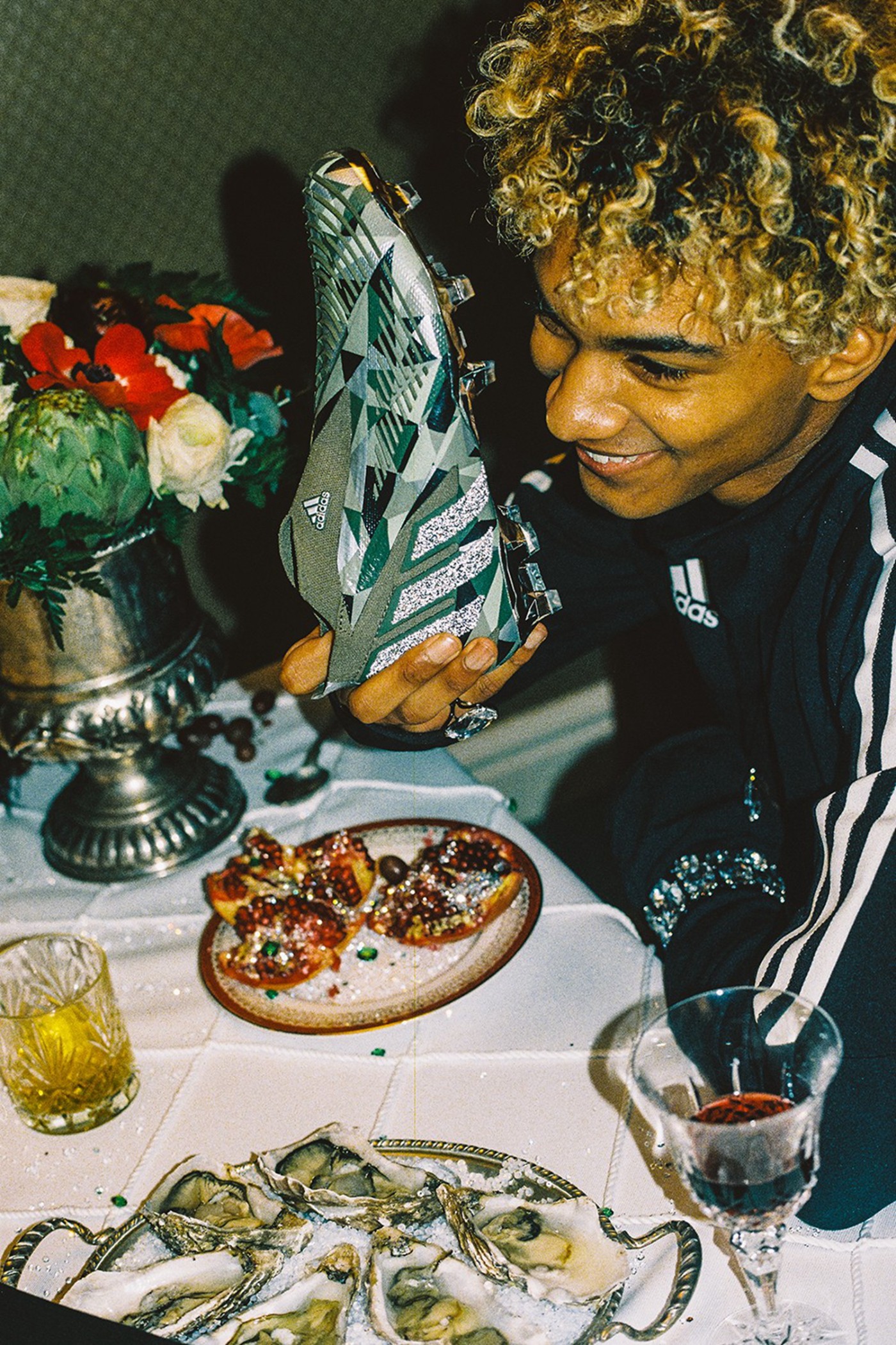 整体设计保留了 adidas 足球鞋近两年的经典风格, 鞋面外侧的代表性三道杠上加上了几千颗精工切面的 Swarovski 水钻,让整鞋视觉效果提升到另一个维度。