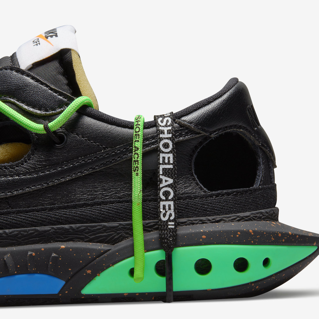 鞋款融合了诸多 Virgil 的惯用手法,鞋面的圆形镂空、Zip Tie 束线带、粗犷的海绵鞋舌、横跨鞋面的鞋带,加上细节处的文字装饰,每个角度都是那熟悉的味道。