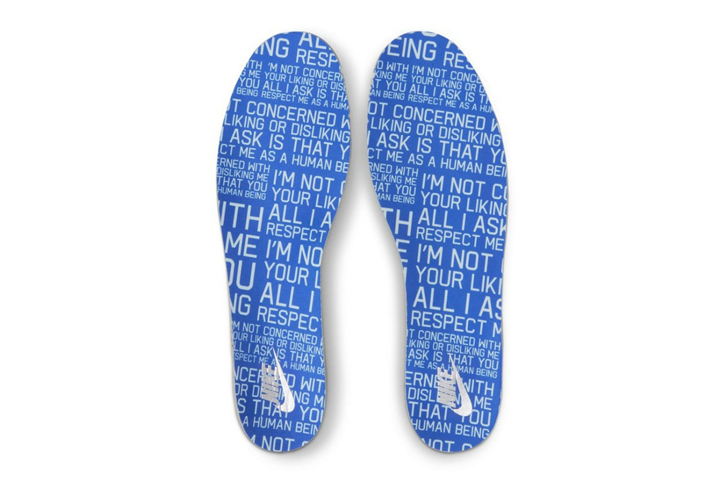 细节上更是精彩,鞋身蓝色框架写满了杰基·罗宾森生前的语录,并以烫银字样呈现。