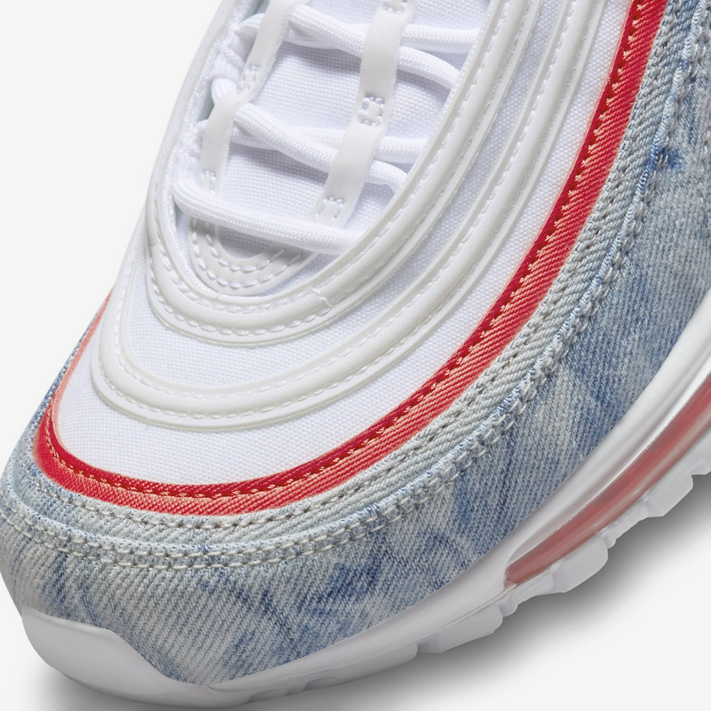 最大的亮点在于环绕鞋身的丹宁布,这样的设计在 Air Max 97 并不常见。