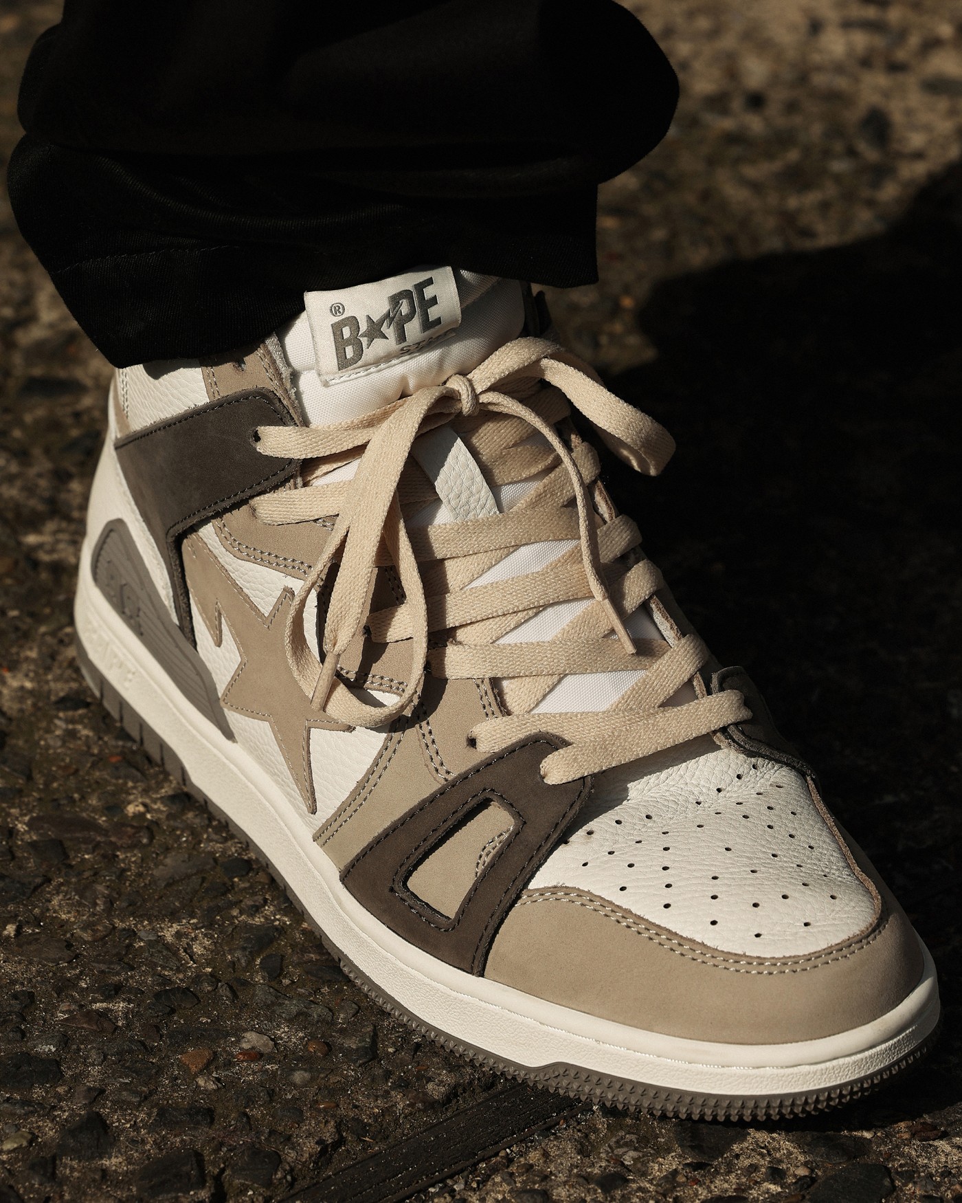 鞋头侧面镂空处理和鞋侧标志性的五角星 Logo,沿袭 BAPE STA™ 系列创新风格,为复古鞋型注入街头活力。