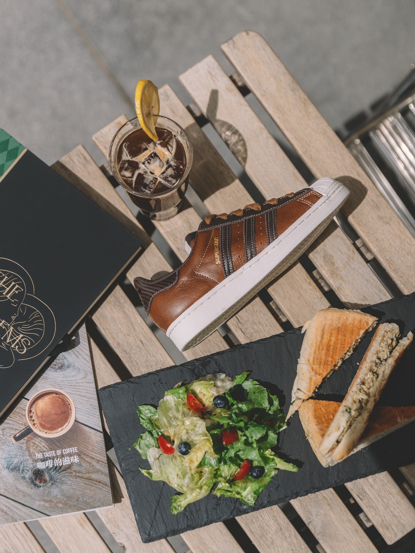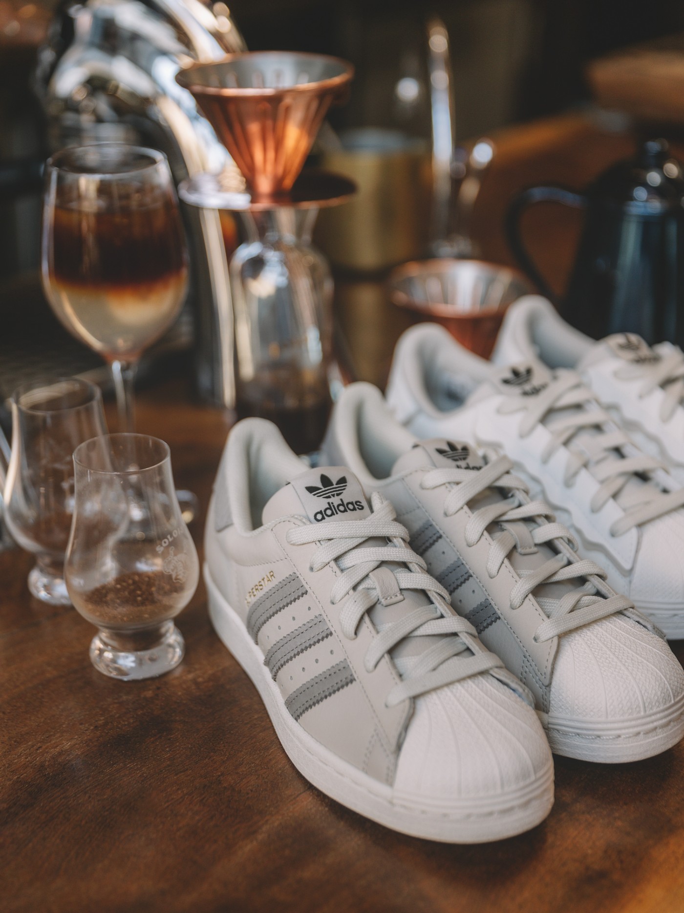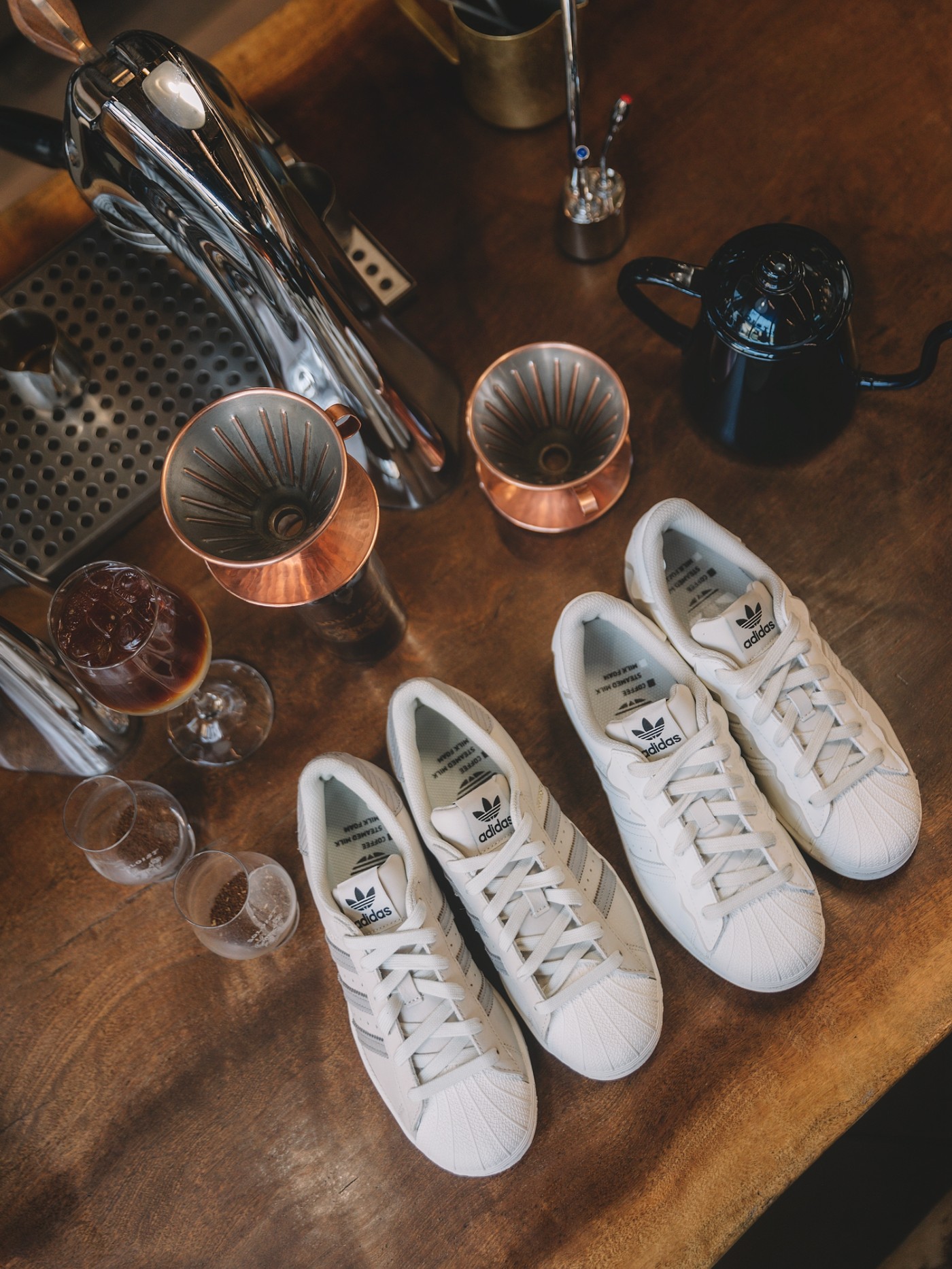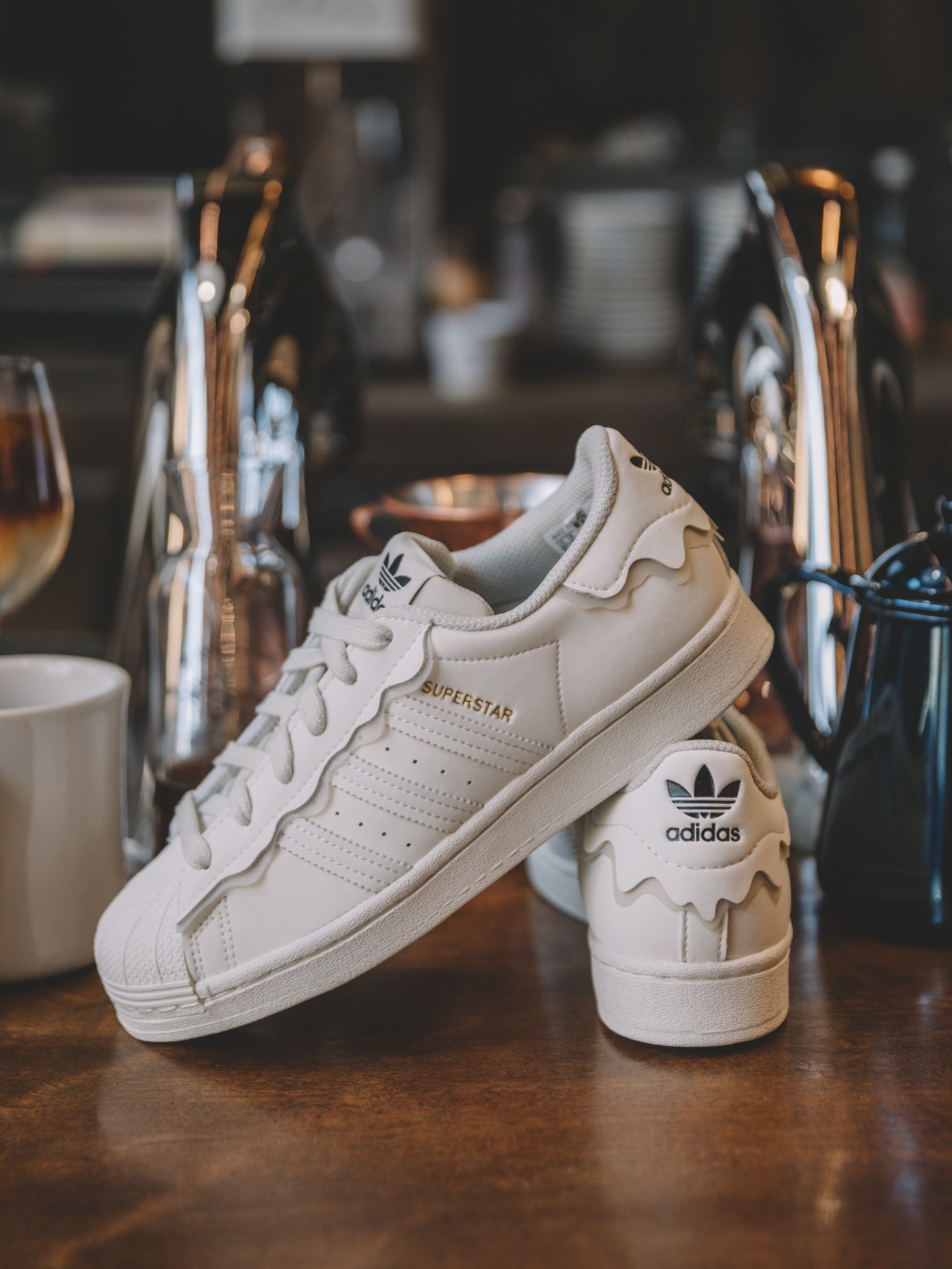 鞋垫印花上更有调制咖啡配方等细节,同时延续了橡胶贝壳头、锯齿三条纹等 Superstar 的标志性元素。