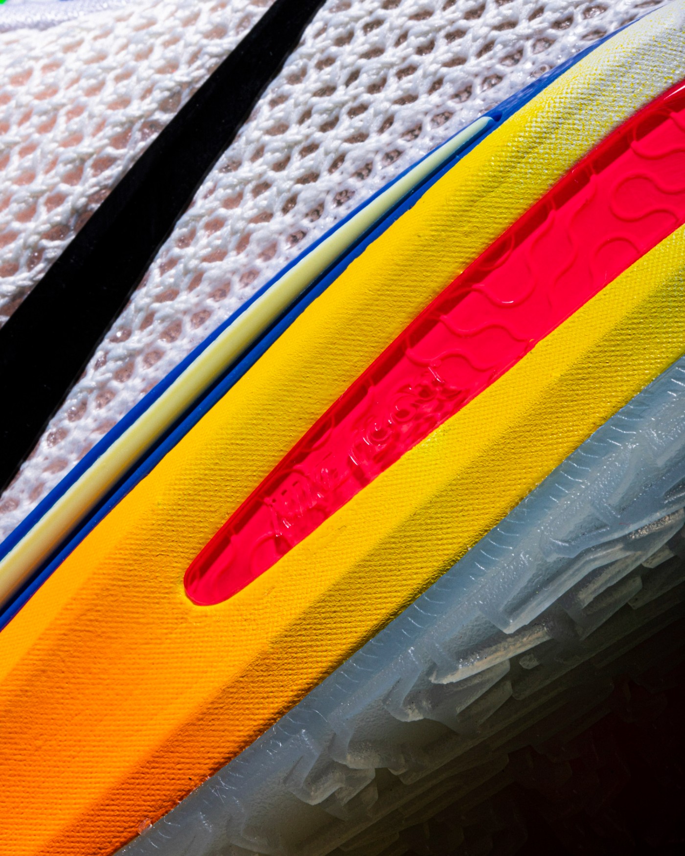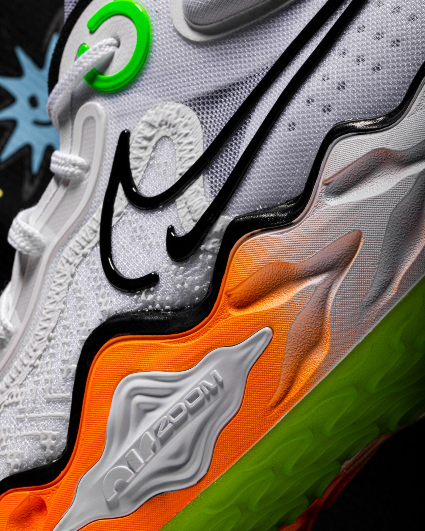 紧接着来到 Air Zoom G.T. Run 采用万花筒配色设计,白色为底,点缀鲜艳的橙色和绿色,活力十足。