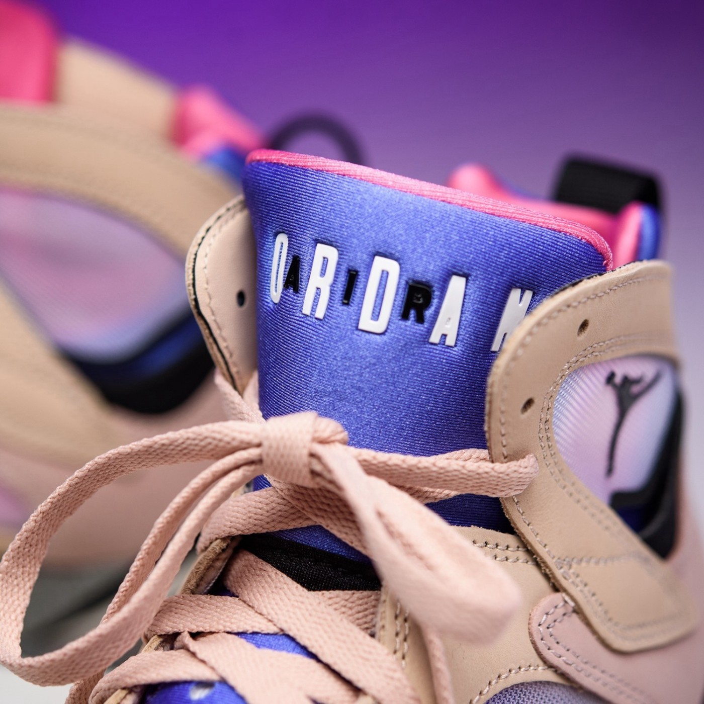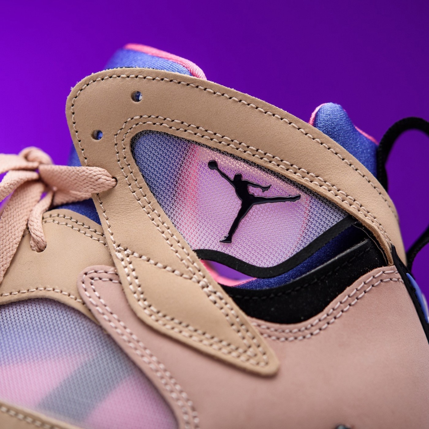 整双鞋承袭 Air Jordan 7 鞋面丰富的特点,鞋身框架采用米白色皮革材质打造,鞋头以侧身部分则是淡淡紫色皮革。