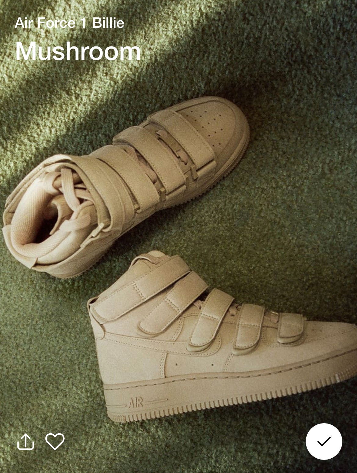 整双鞋的官方命名为 Nike Air Force 1 Billie “Mushroom”,采用蘑菇黄色打造鞋面,融入碧梨标志性的 Oversize 风格。
