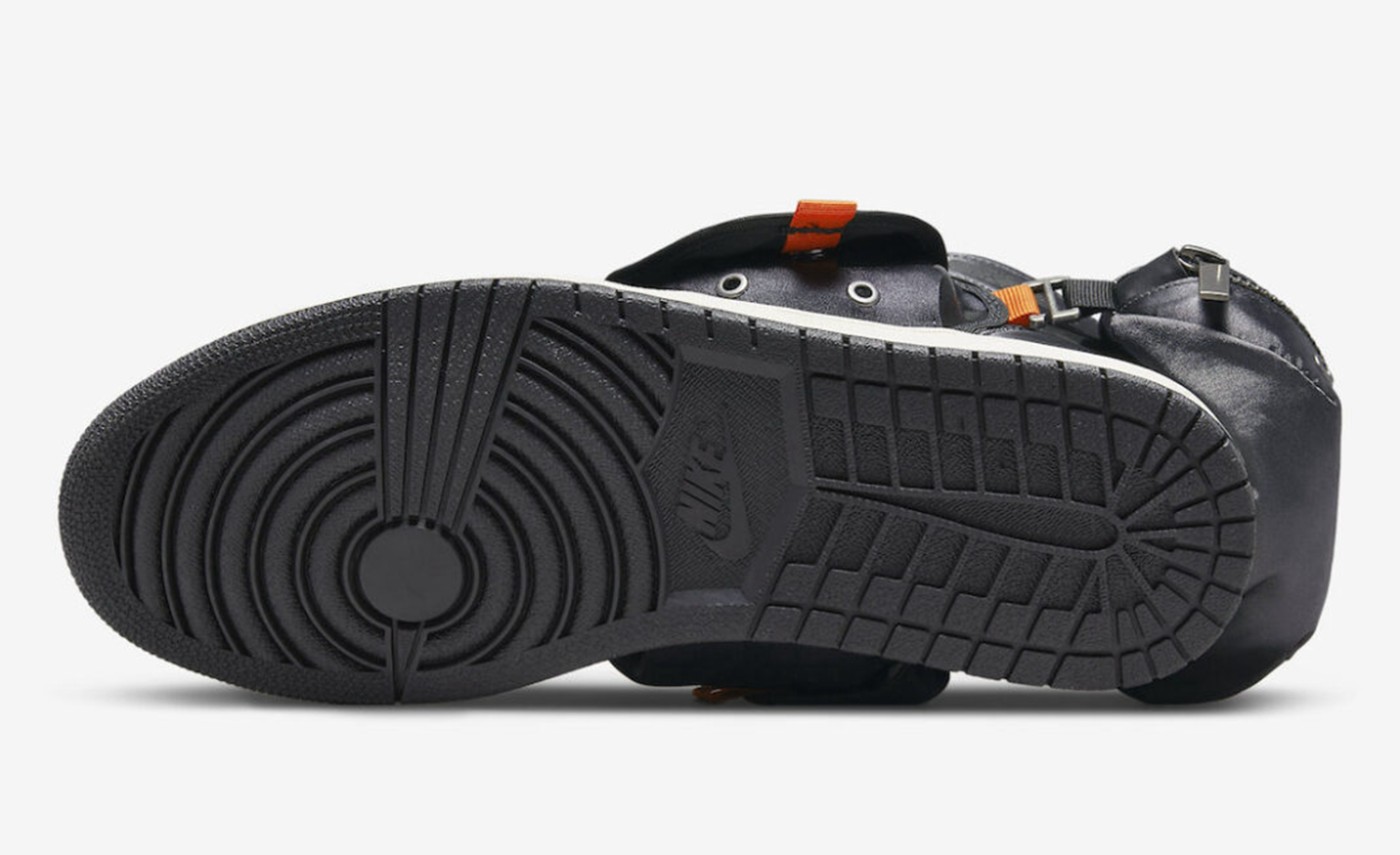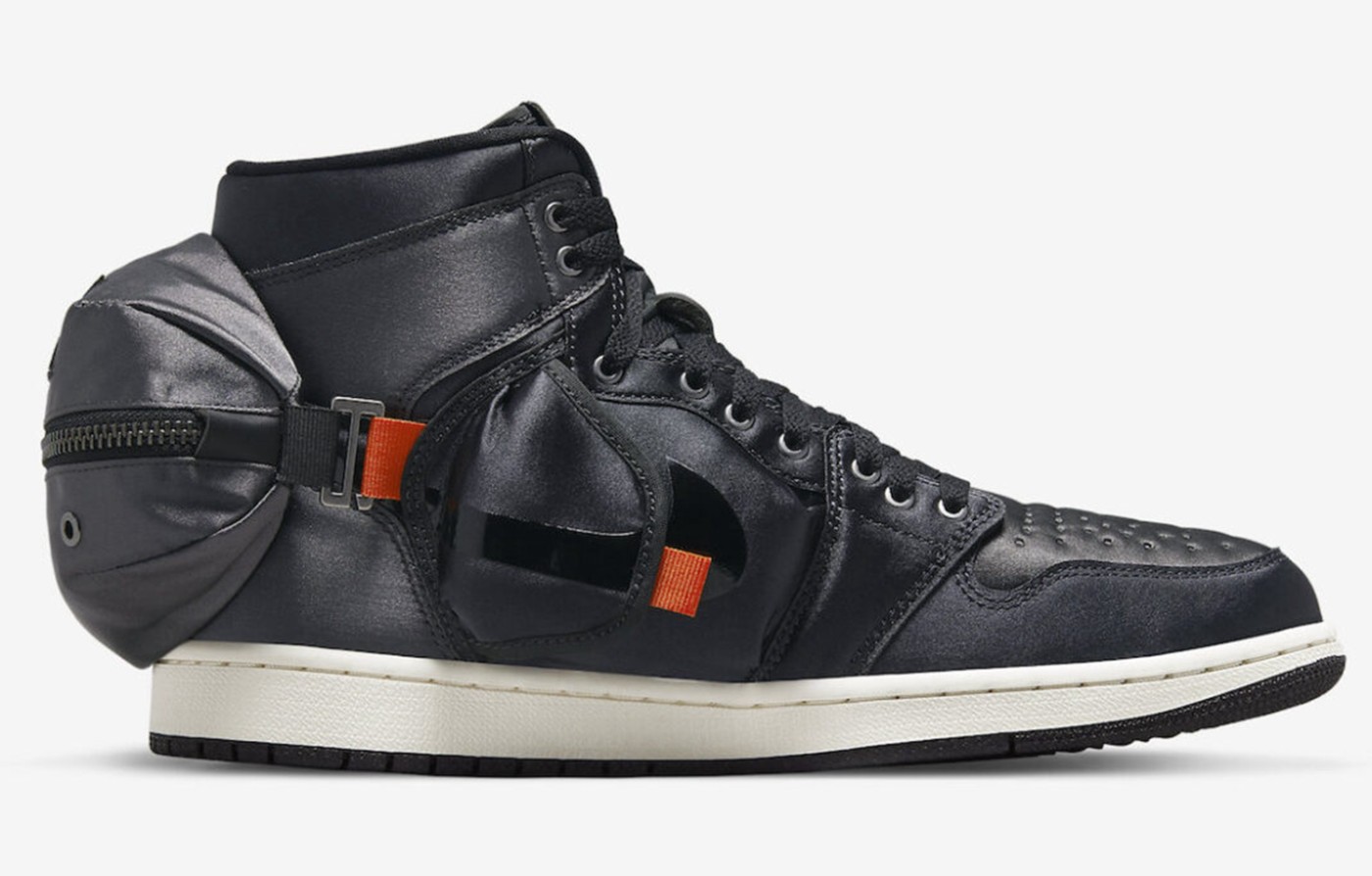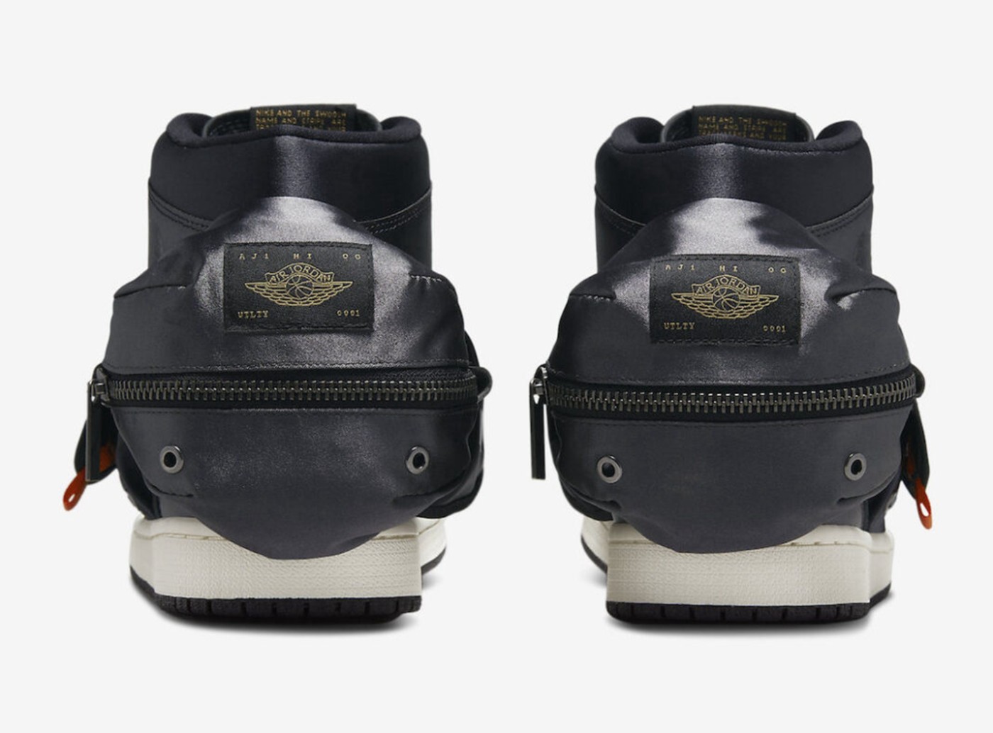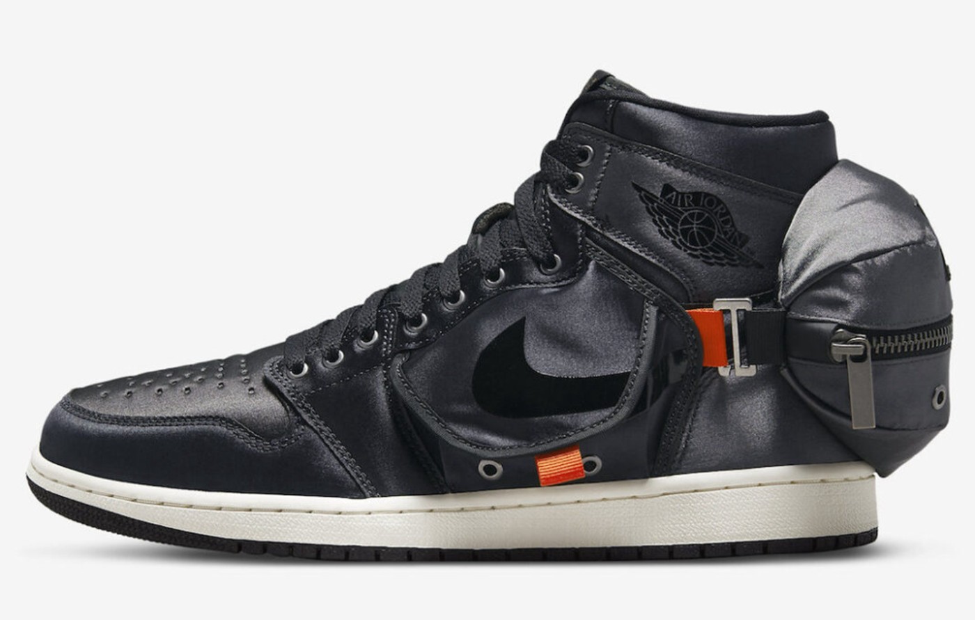 Air Jordan 1 经典的 Nike Swoosh 元素与这几个兜融合在一起,主体的「钩子」印在两侧兜的盖板上,向后的延长线刚好是后跟腰包的拉锁部位,这「球鞋带兜」属实让 Jordan Brand 玩明白了。