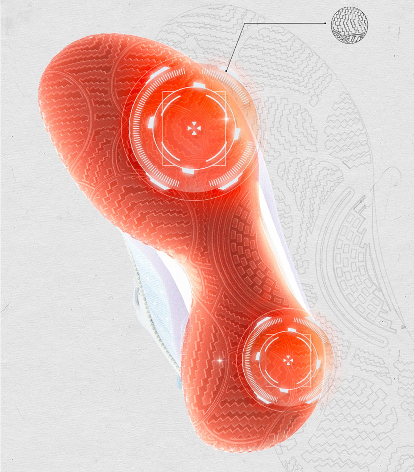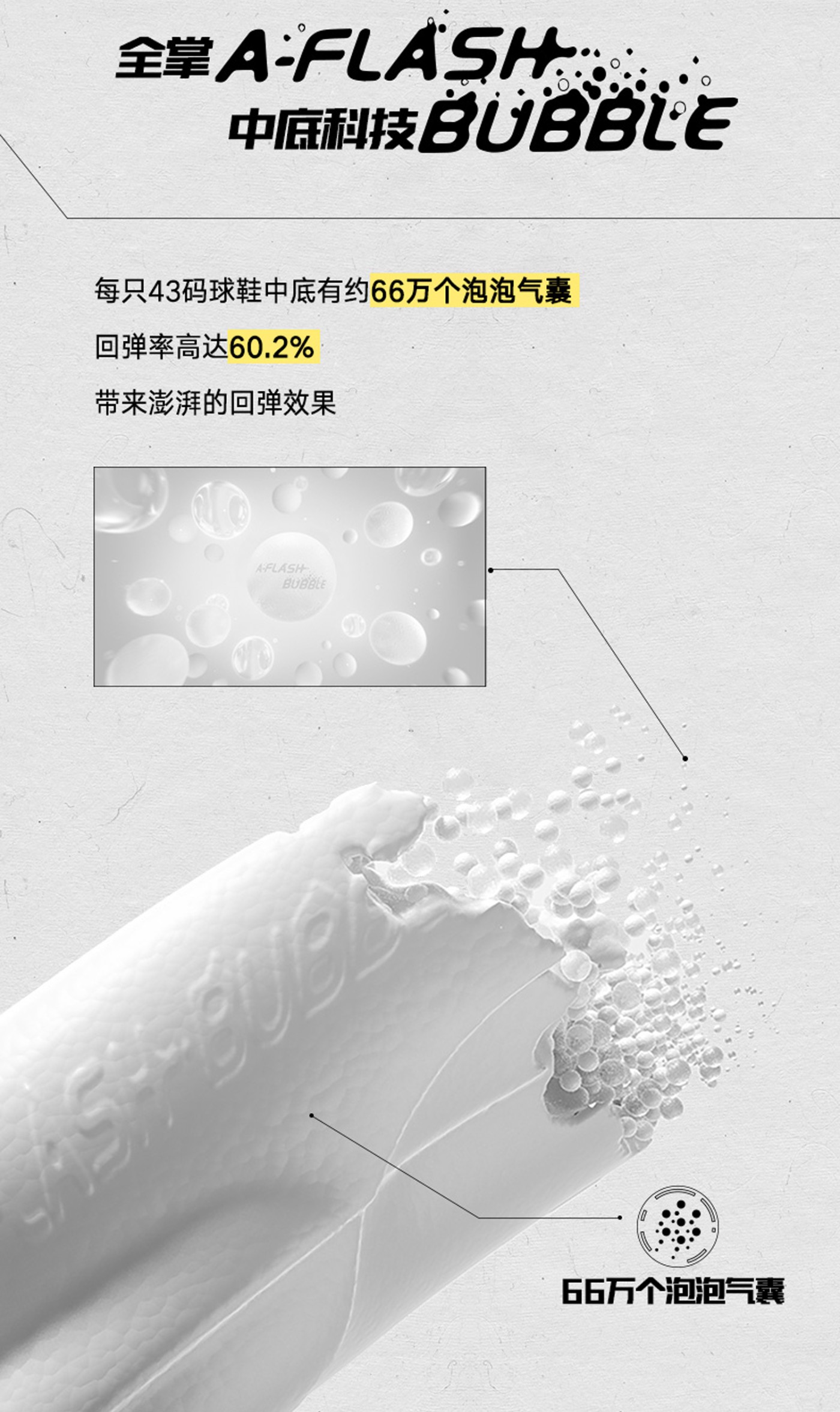 中底搭载全掌 A-Flash Bubble 缓震科技,中底含有 66 万个泡泡气囊,缓震、回弹及耐久性都比传统中底有所提升。