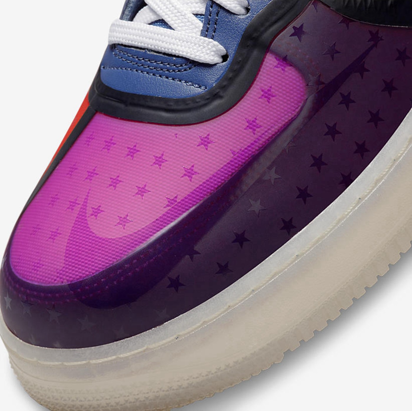 中底和外底均采用乳白色半透明水晶底打造,和鞋面多种颜色形成一定的视觉反差效果。