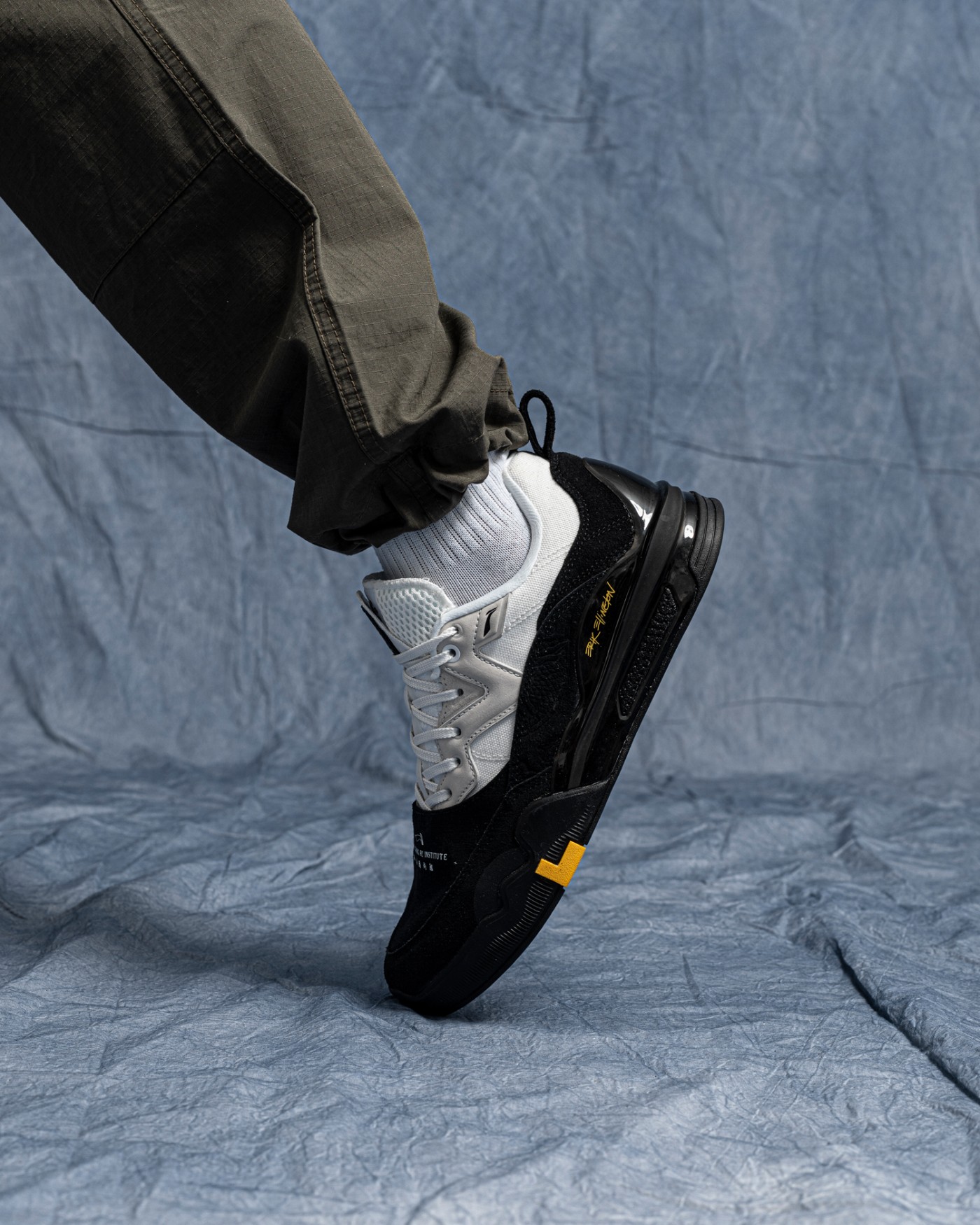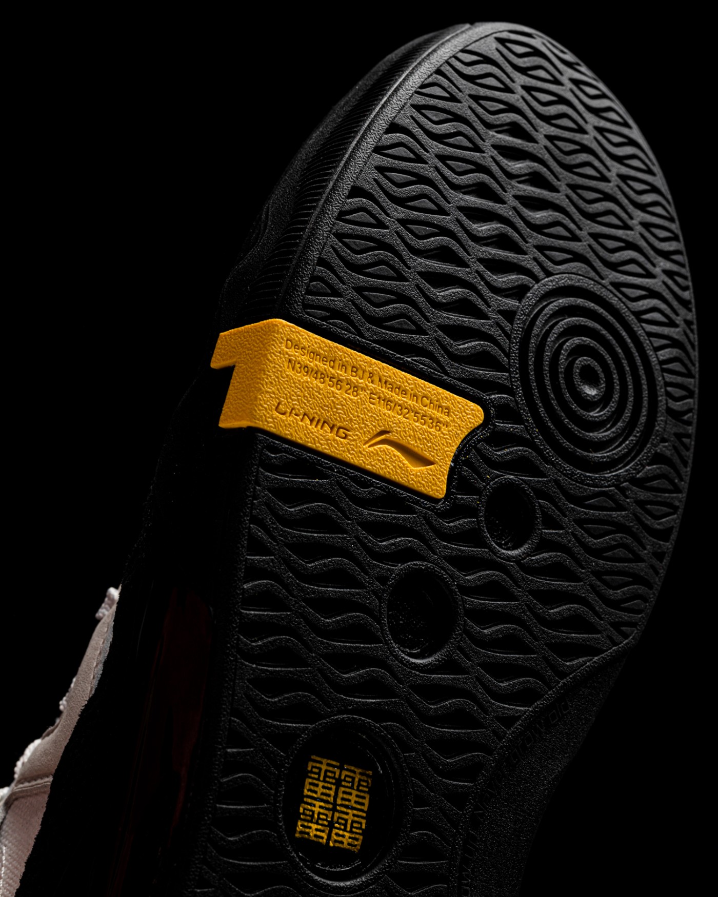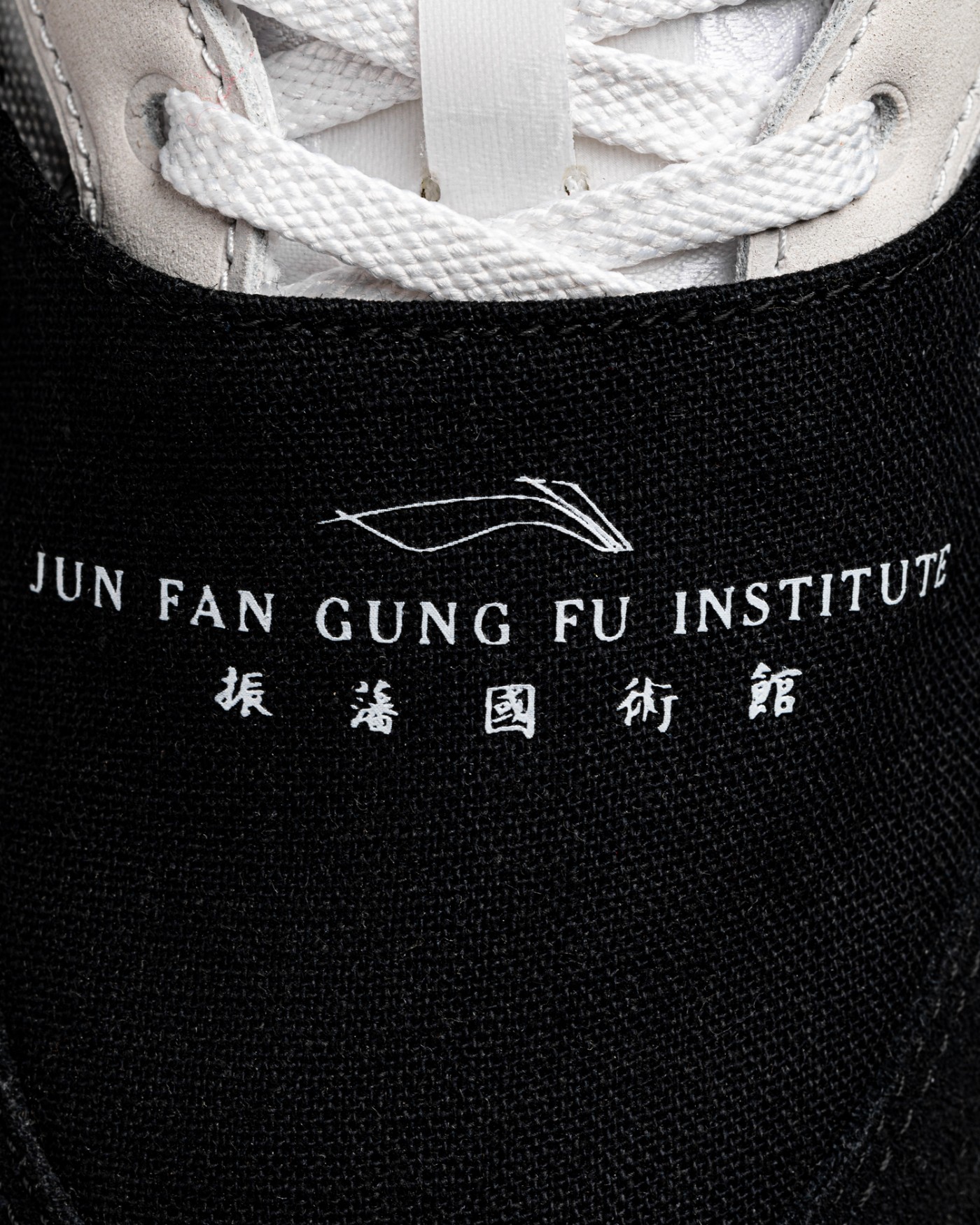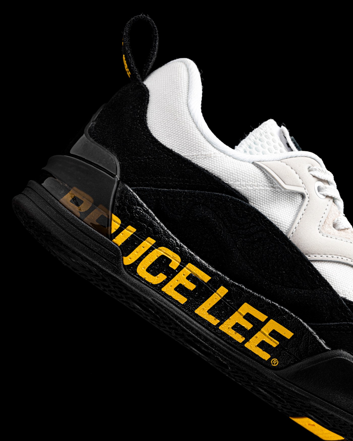 鞋身采用上白下黑的设计,模仿李小龙经常穿着的黑色功夫鞋搭配白袜造型。