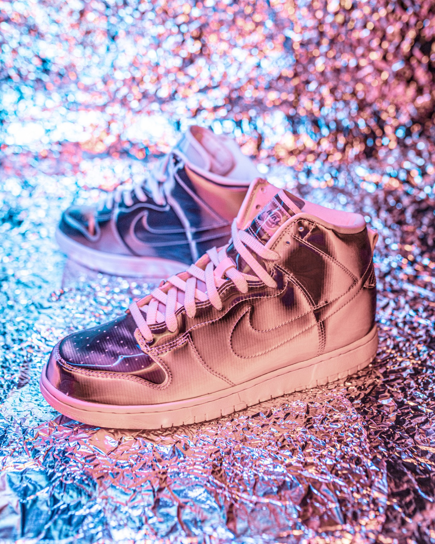 最后来说说这双冠希联名,「凝结集团」可以说是 Nike 联名的老伙计了,这双 Dunk High 采用酷炫的液态银鞋面,还融入闪卡材质的理念,无论从哪个角度看都有独一无二的视觉效果。