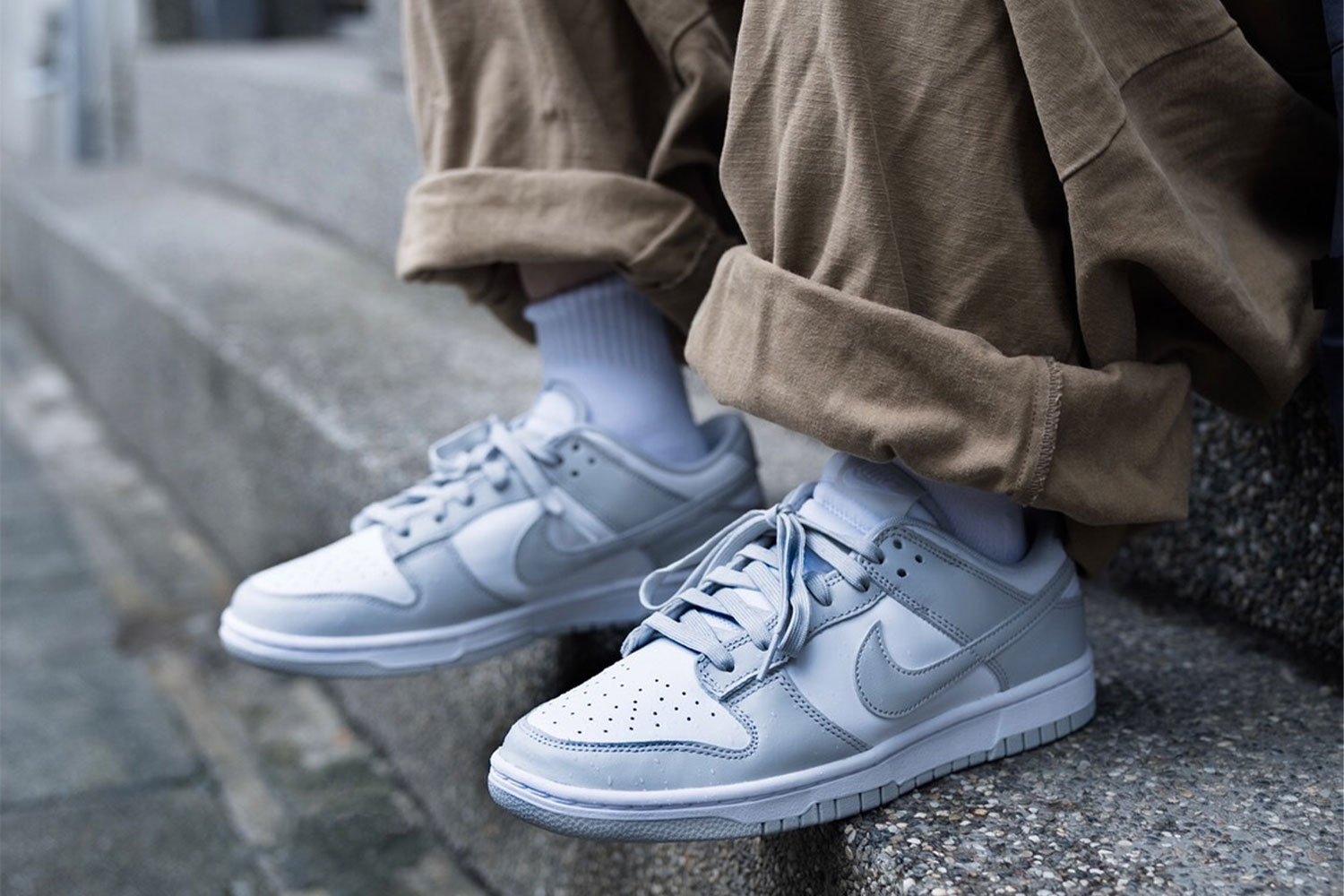 又是一双以灰色为主体的 Dunk Low,百搭属性尽显,尤其是鞋带扣上闪闪发光的金剃刀,更是点睛之笔。