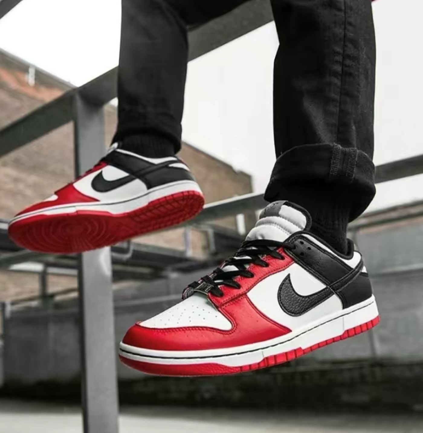 这双 Dunk Low 以芝加哥公牛队为设计灵感,使用 Air Jordan 系列经典的黑白红配色。
