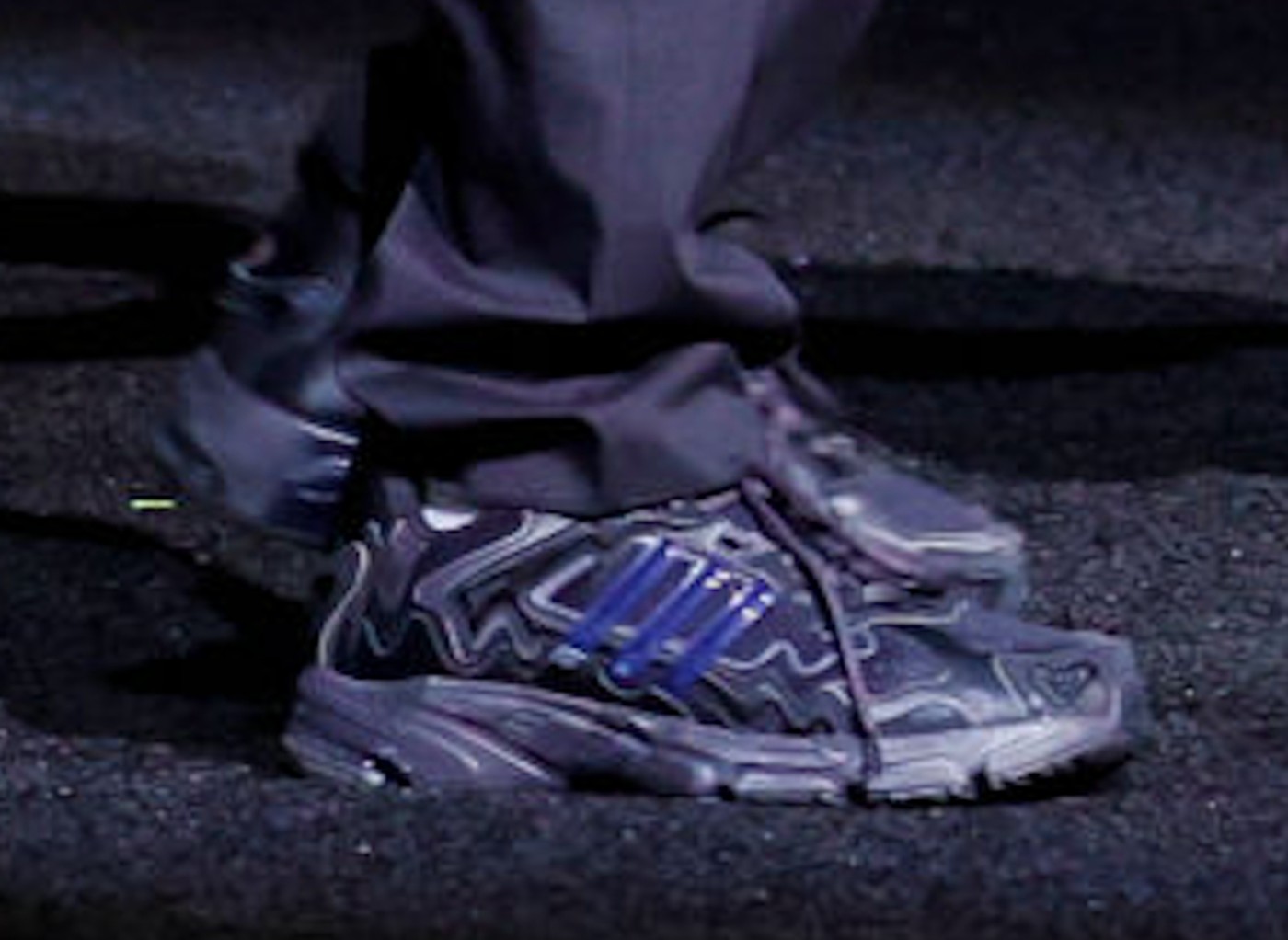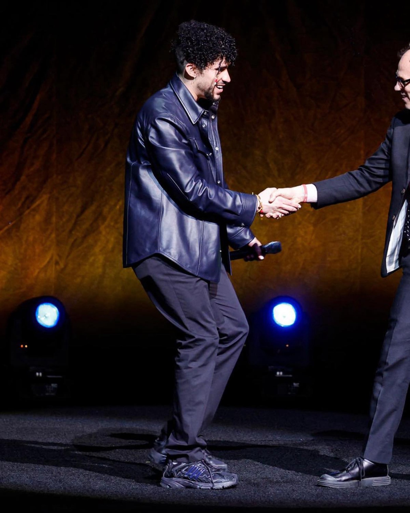 整鞋配色以黑色为主,和 Bad Bunny 本人穿着的黑色西装相得益彰,鞋身两侧三道杠 Logo 采用深蓝色点缀,让鞋面看起来并不单调。