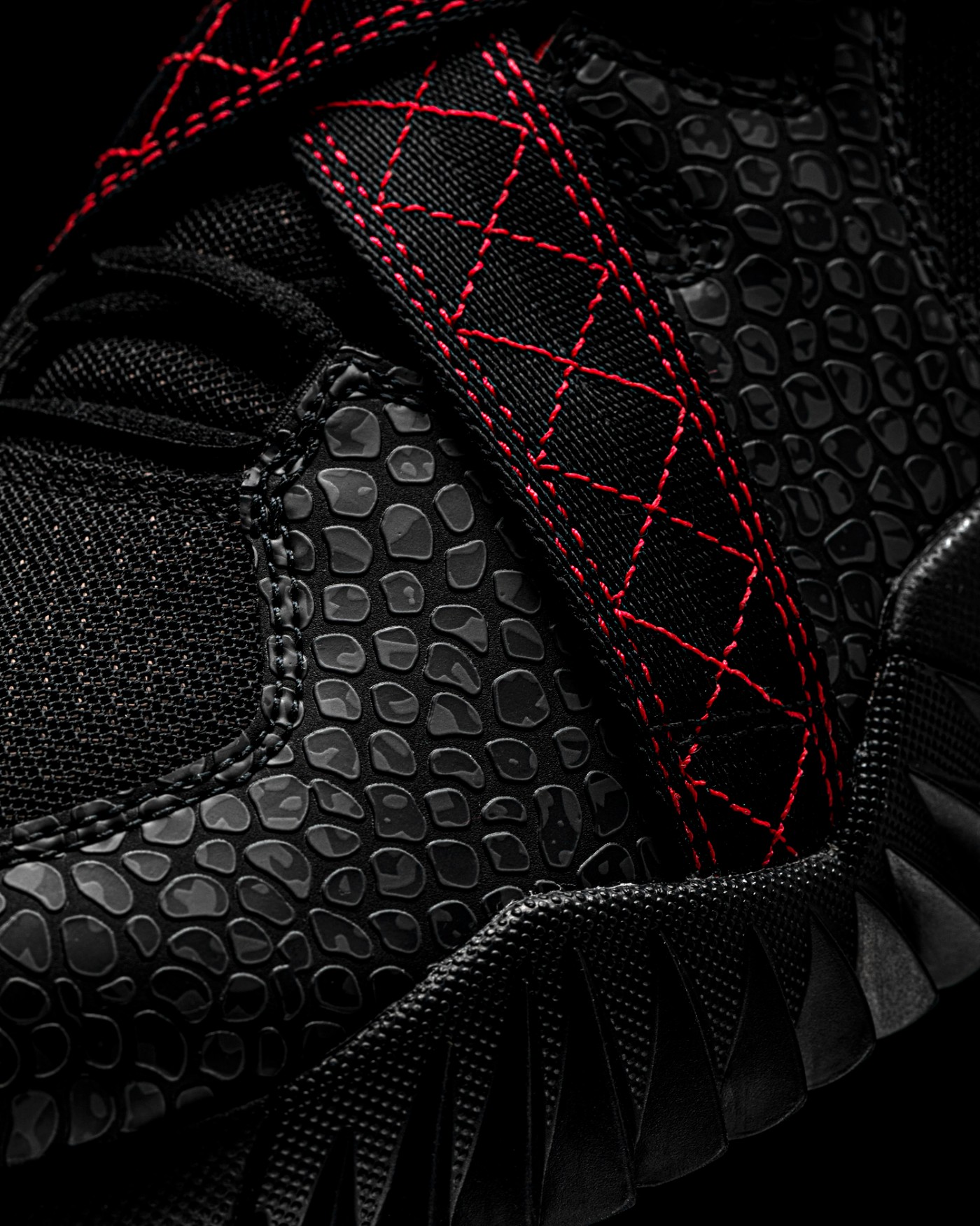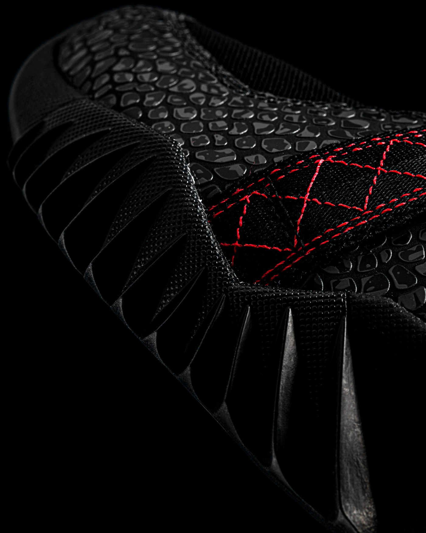 环绕着网眼材质的是一层龙鳞质感的皮质,立体的手感摸上去很特别,并且还十分坚固,保证耐用性的同时,能更好的保护脚部。