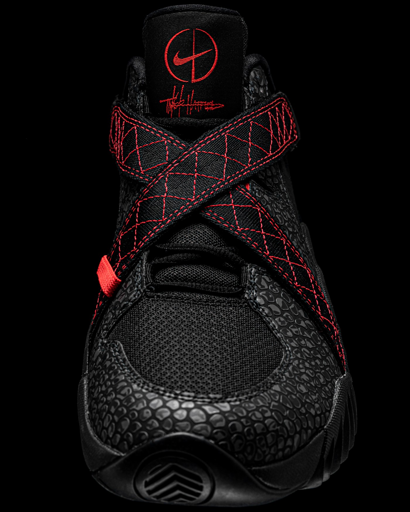 最大的亮点必须是鞋面的 X 型绑带,这也是 Tinker 标志性的设计之一,像他操刀的 Air Jordan 8、Nike Air Raid 都有类似的设计。