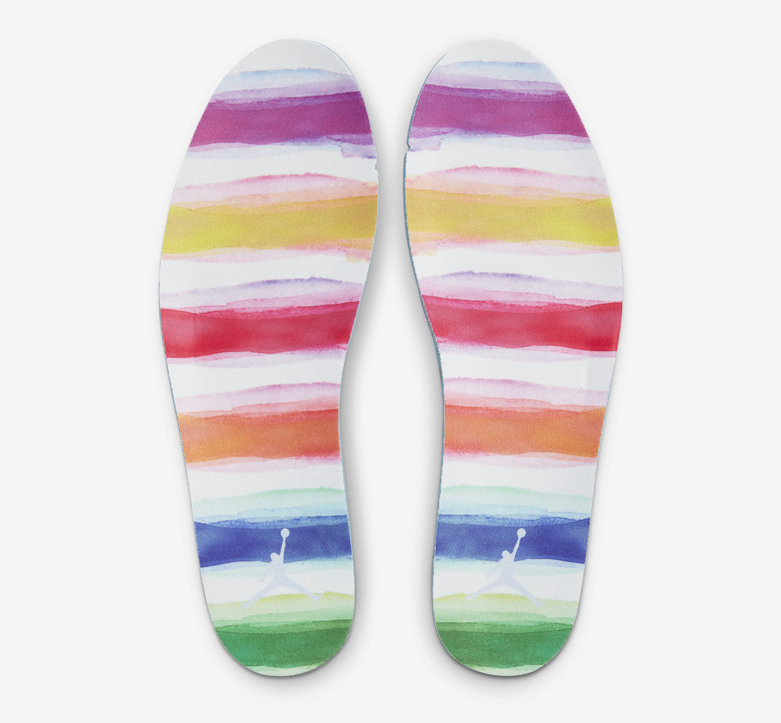 五彩斑斓的条纹鞋垫寓意「复活节彩蛋」,配合后跟银色 Jumpman Logo 刺绣,细节处体现设计巧思和精致感。