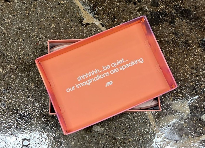 后跟位置传承下来 JFG LOGO 彰显联名身份,同时左右脚分别装饰超大刺绣设计,体现此次联名的全新主题「Inside Voices」。
