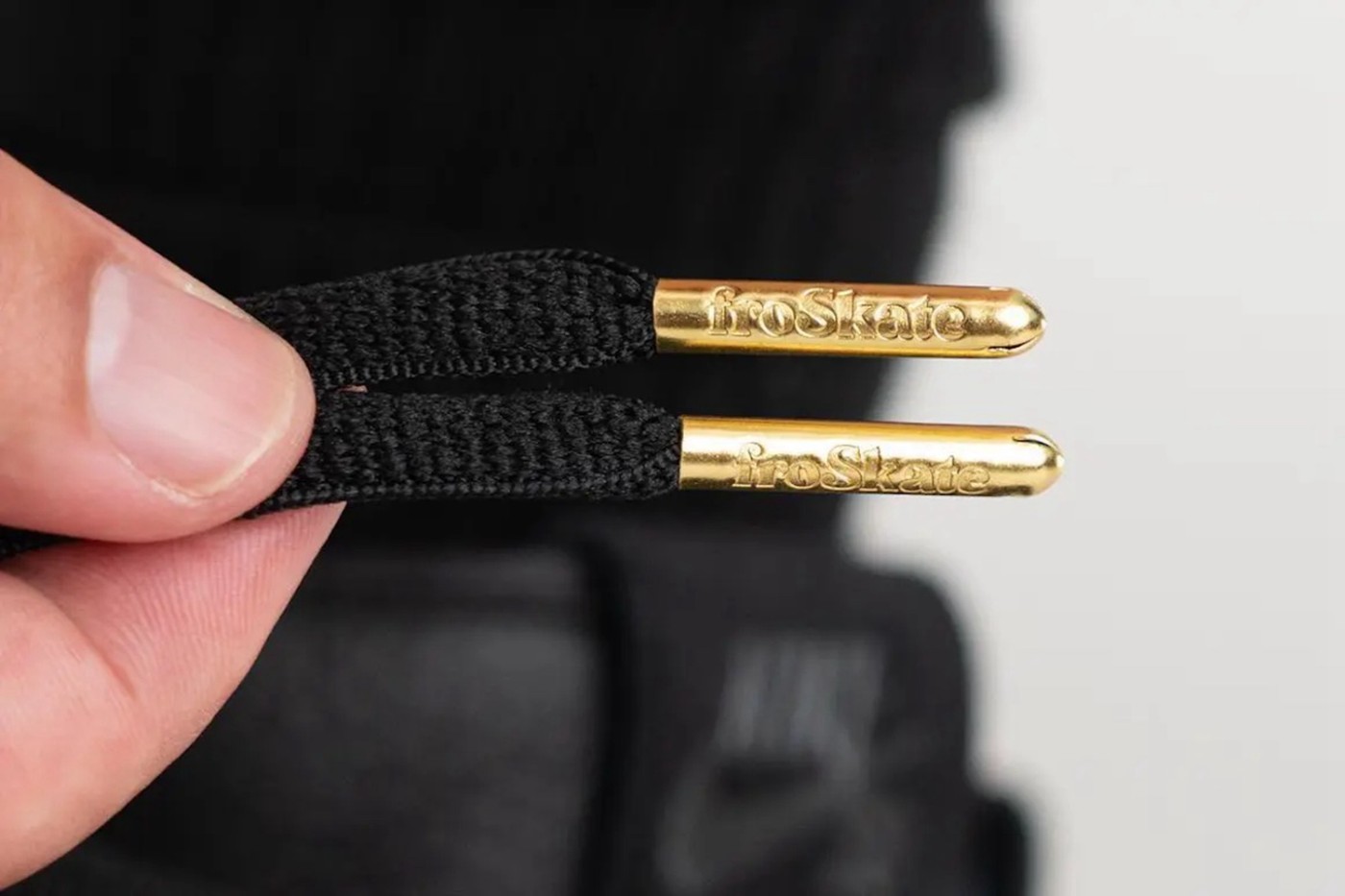 金色和黑色交织的鞋带也让整鞋观感大大增加,鞋带头采用金属材料,还有着 “froSkate” 的字样。
