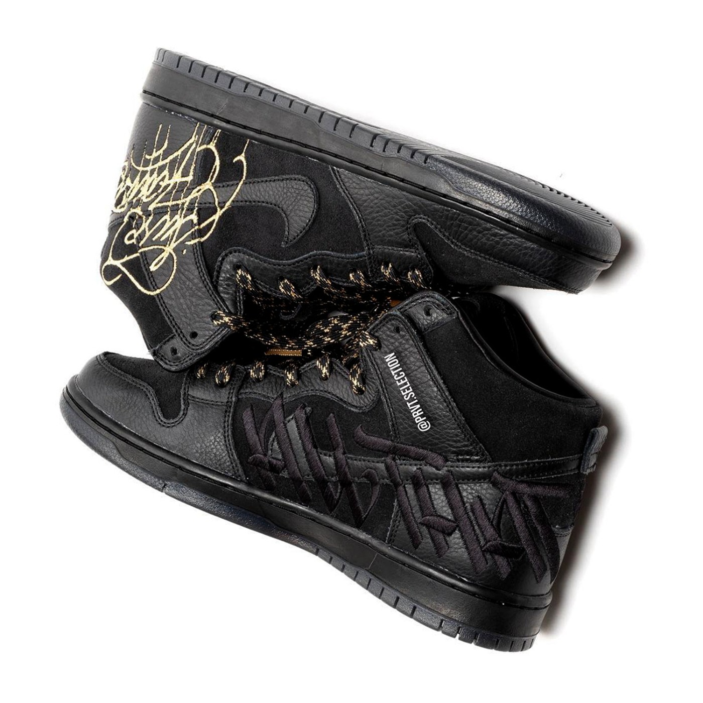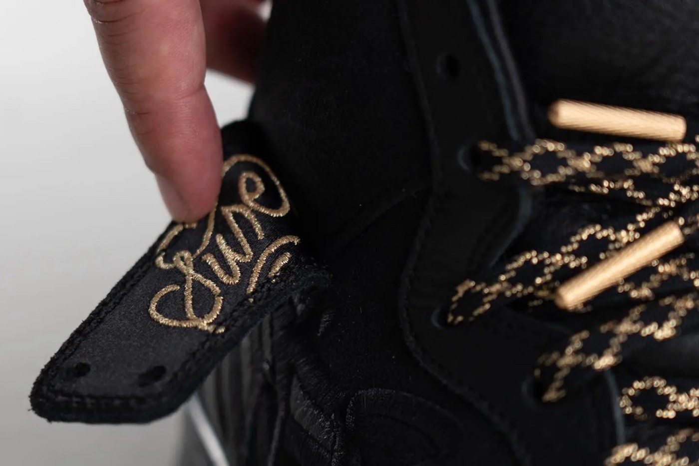 最吸引人眼球的莫过于鞋帮附近的刺绣,分别用金色和黑色的线材勾勒出独特的造型,看来这无疑出自 FAUST 的手笔。