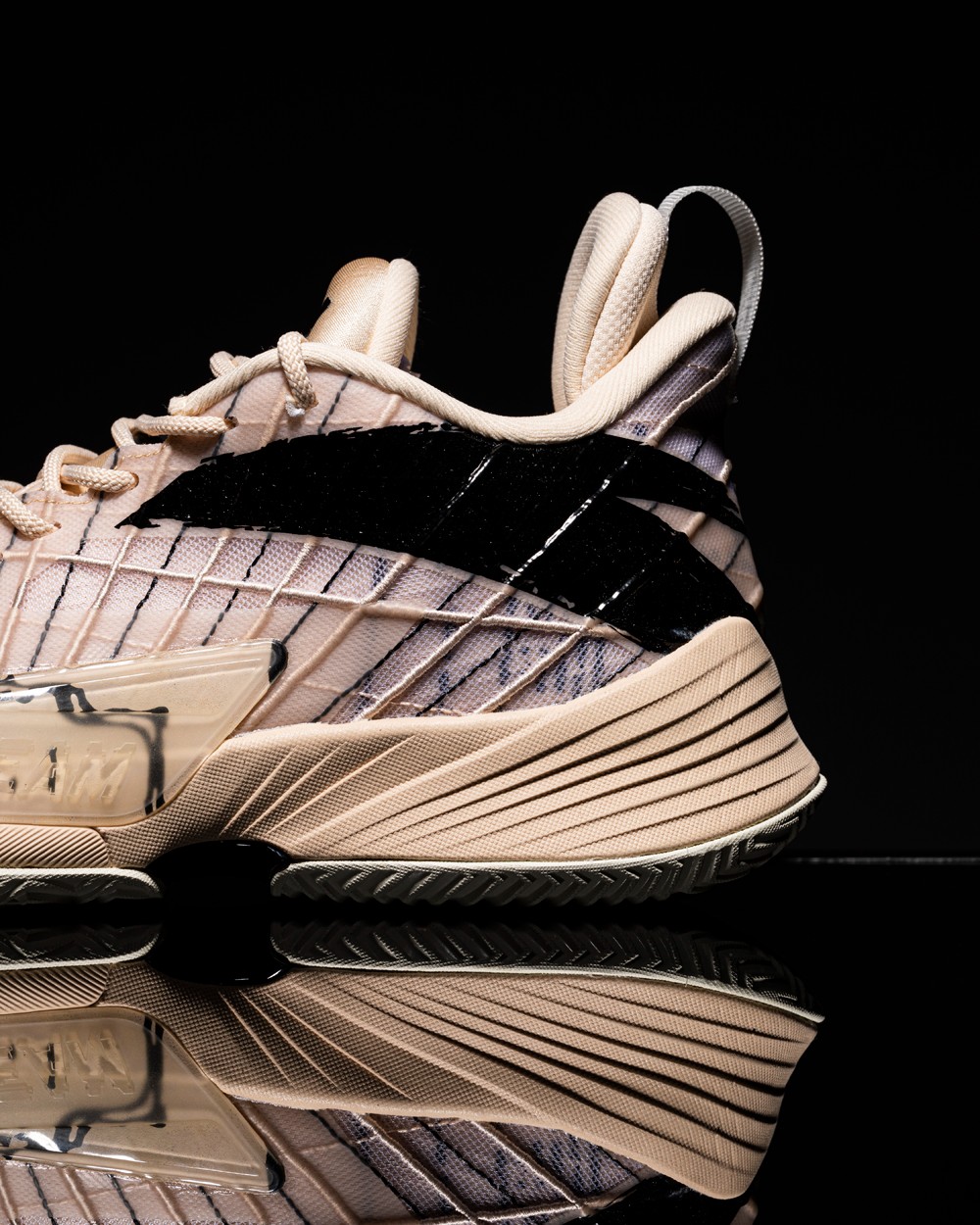 整双鞋以燕麦色为主调,鞋面采用高强度网纱,辅以热熔材质补强,带来良好透气性与支撑性。