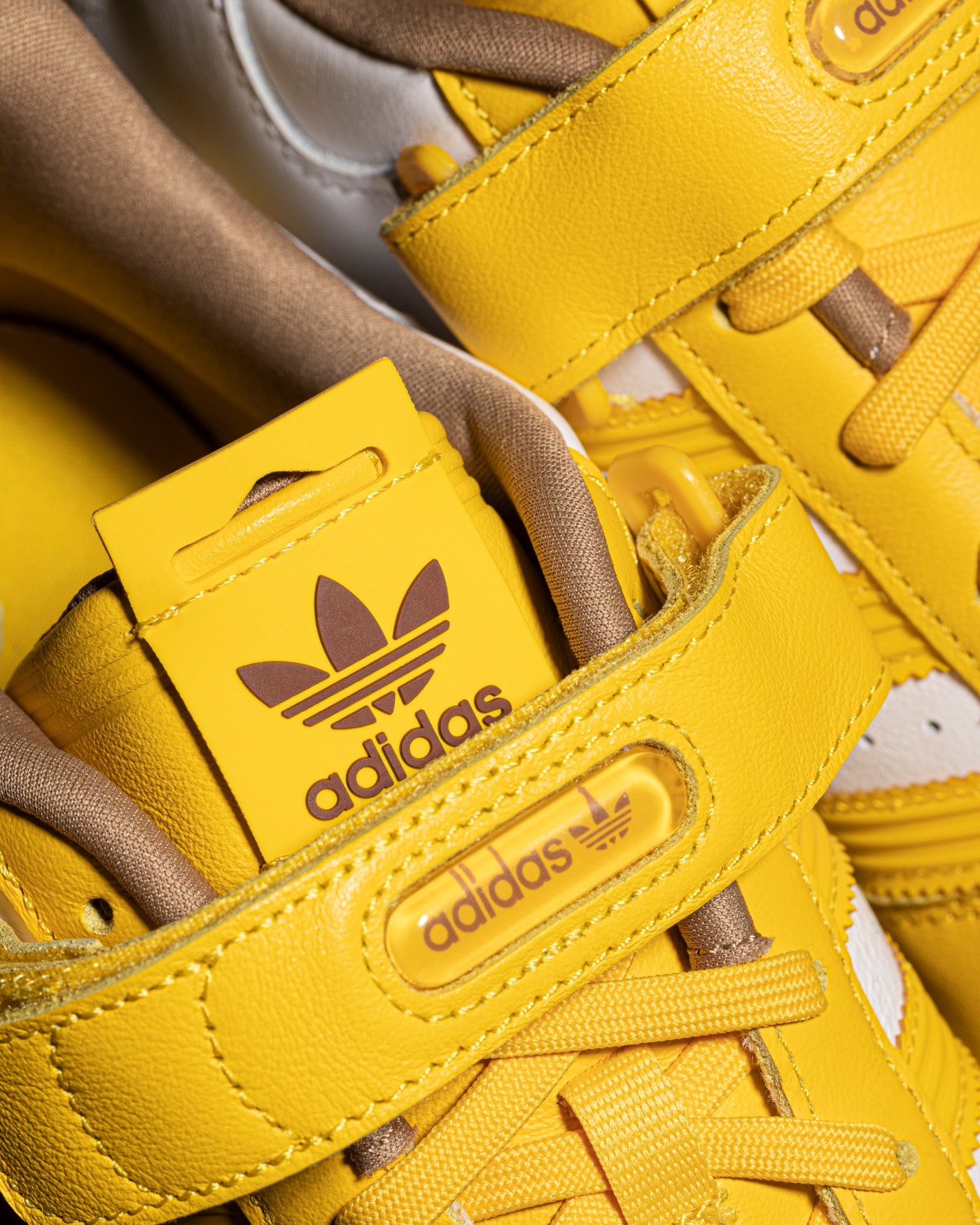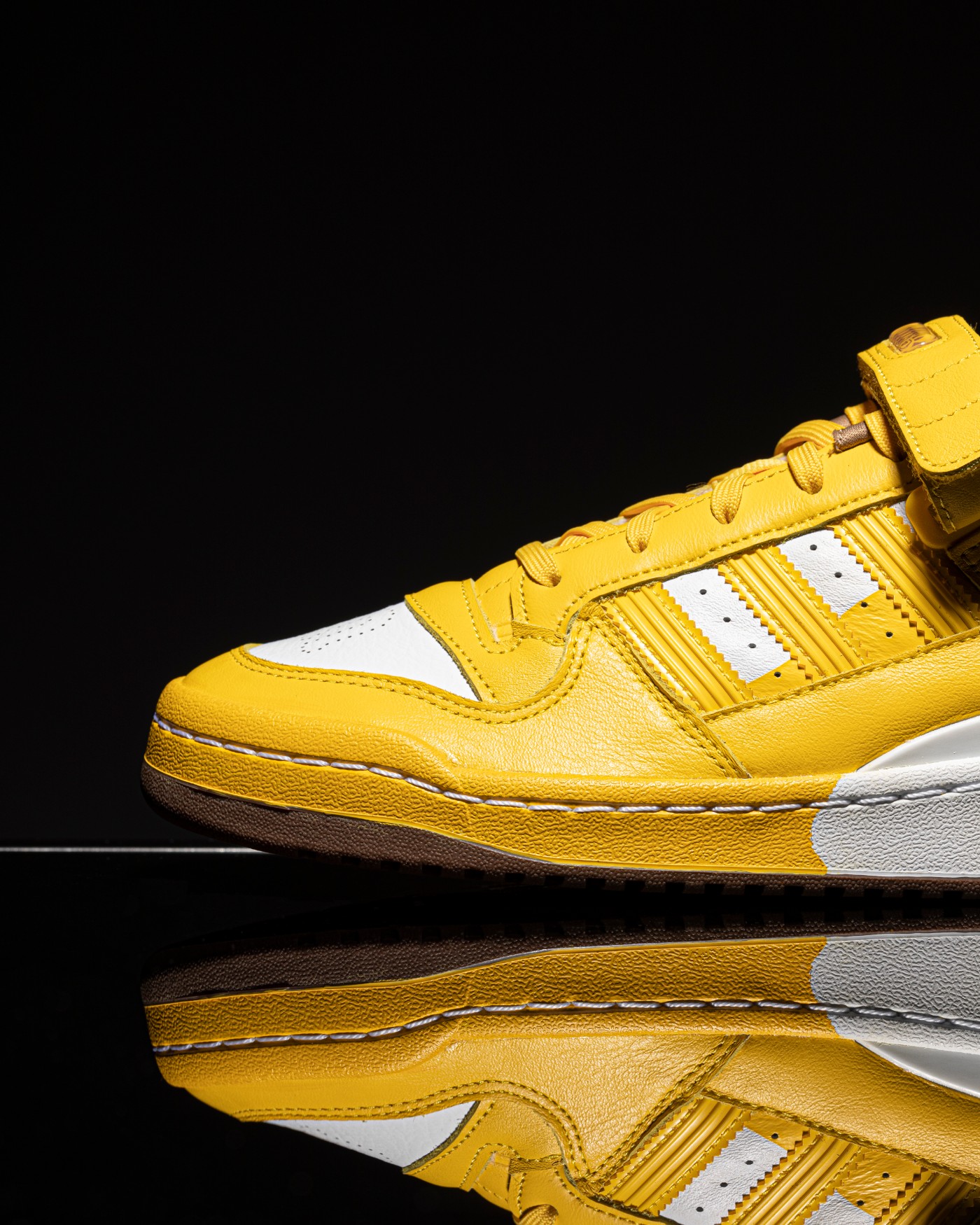 鞋身由第一双联名 Forum 84 的全黄色改为白黄双色方案,保持了 Forum 一贯的高规格皮革用料,触感相当柔软。