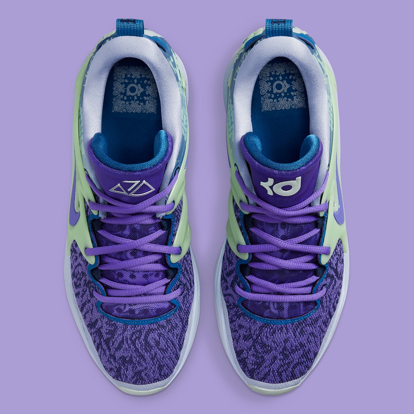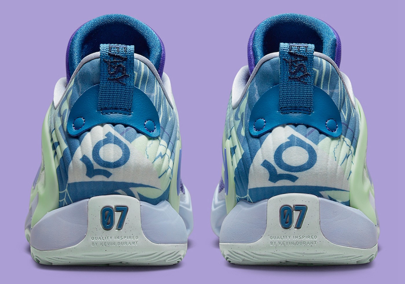 两只脚的鞋舌分别写有 KD 和 BK7 的字样,代表着杜兰特本人以及布鲁克林 7 号。