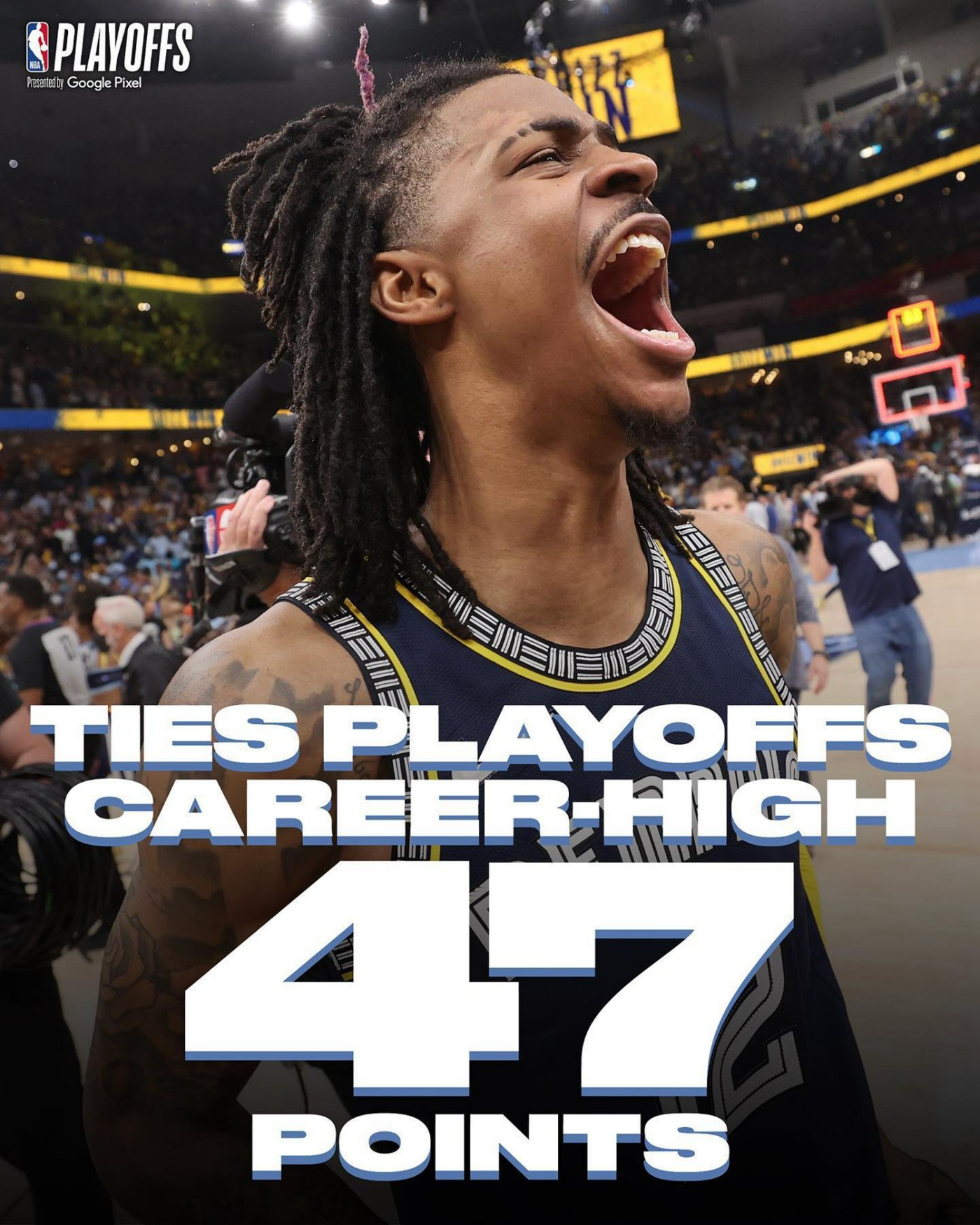 没了得力帮手,“NBA 腰王” 贾·莫兰特开启 Carry 模式,全场爆砍生涯最高的 47 分,其中末节更是包揽全队最后 15 分,带队拿下比赛。