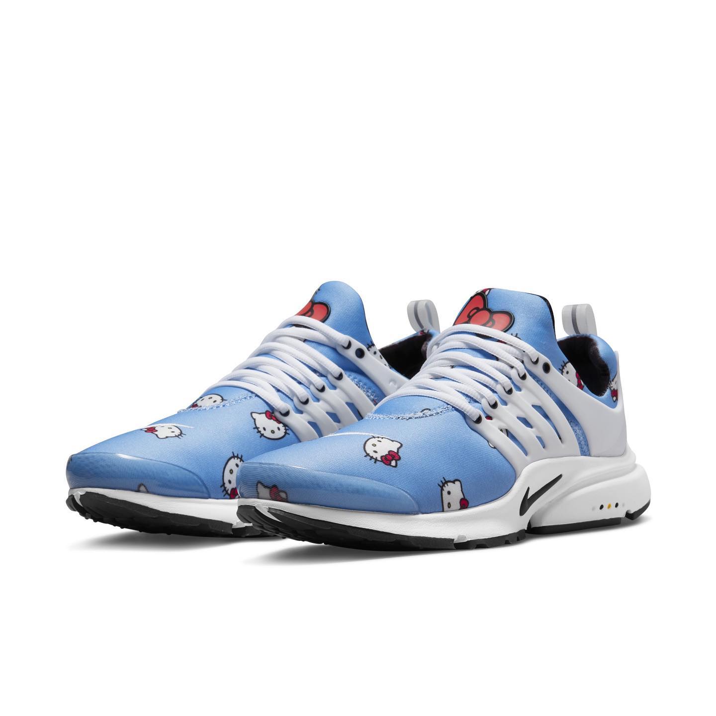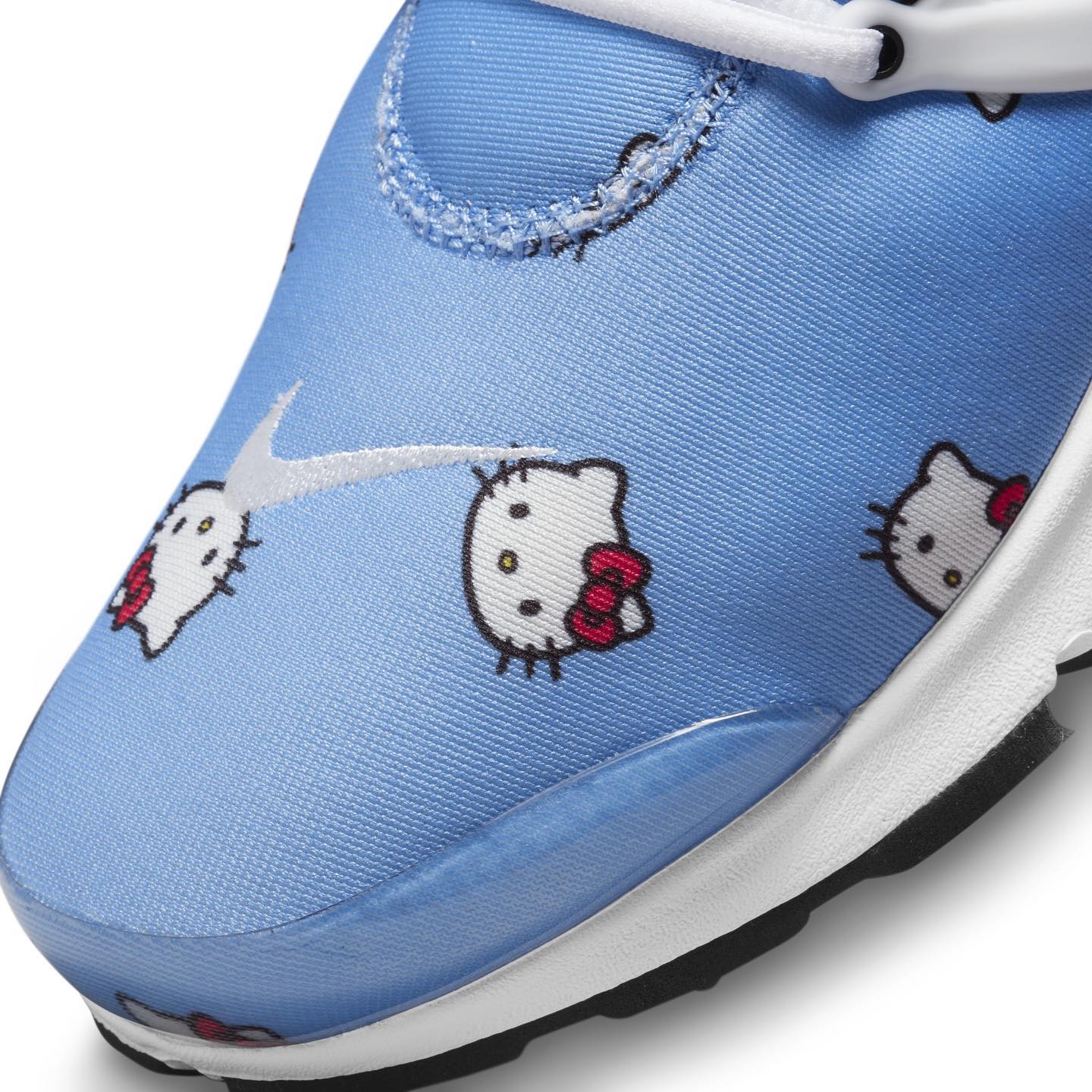 天蓝鞋面搭配白色 Air Presto 框架及中底示人,鞋面满印 Hello Kitty 卡通头像与后跟相呼应。