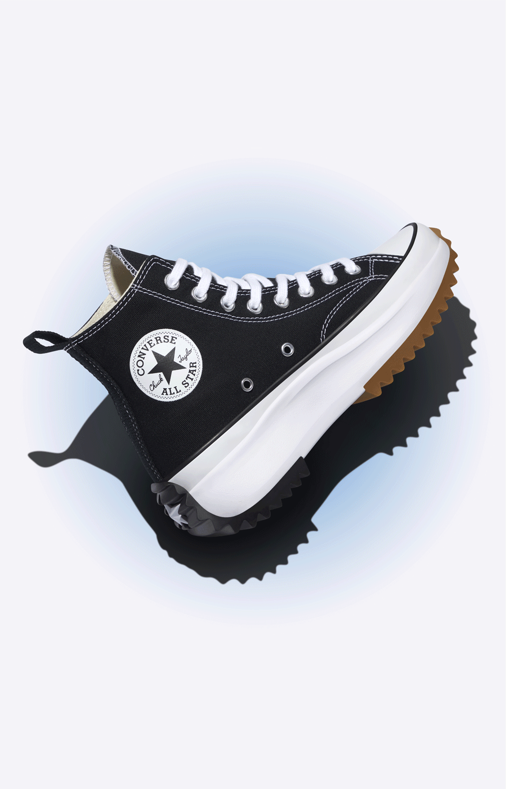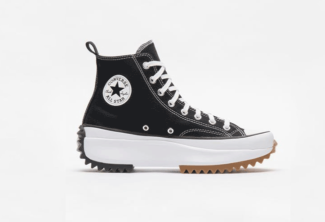第一款 RUNSTAR HIKE 高帮流星厚底鞋,鞋面设计保留 Chuck 70 经典造型,后跟嵌有醒目的撞色星星图标。