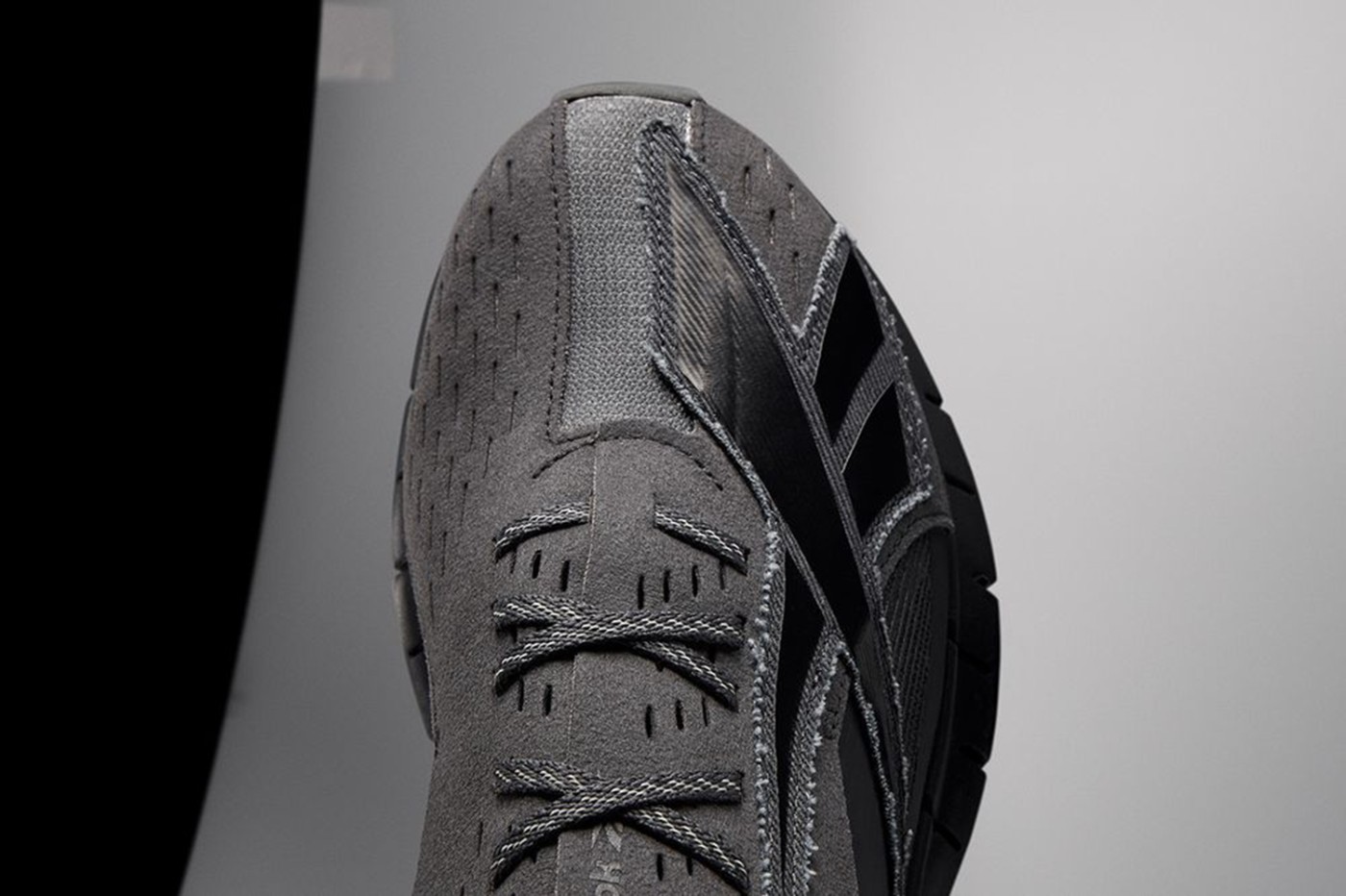 鞋头外侧的 Reebok Logo 使用织物材料制作,并且用粗犷的走线缝制在鞋面上,鞋舌使用大网布材料,鞋带也能按自己的喜好自行调节。