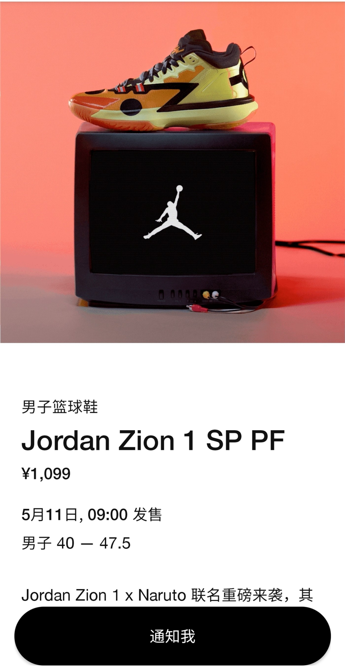 最后是大家关心的发售信息,Jordan Brand x 《火影忍者(Naruto)》Zion 1 “Kyuubi” 将于 5 月 11 日早九点正式发售,发售价格为 ¥1099 元。