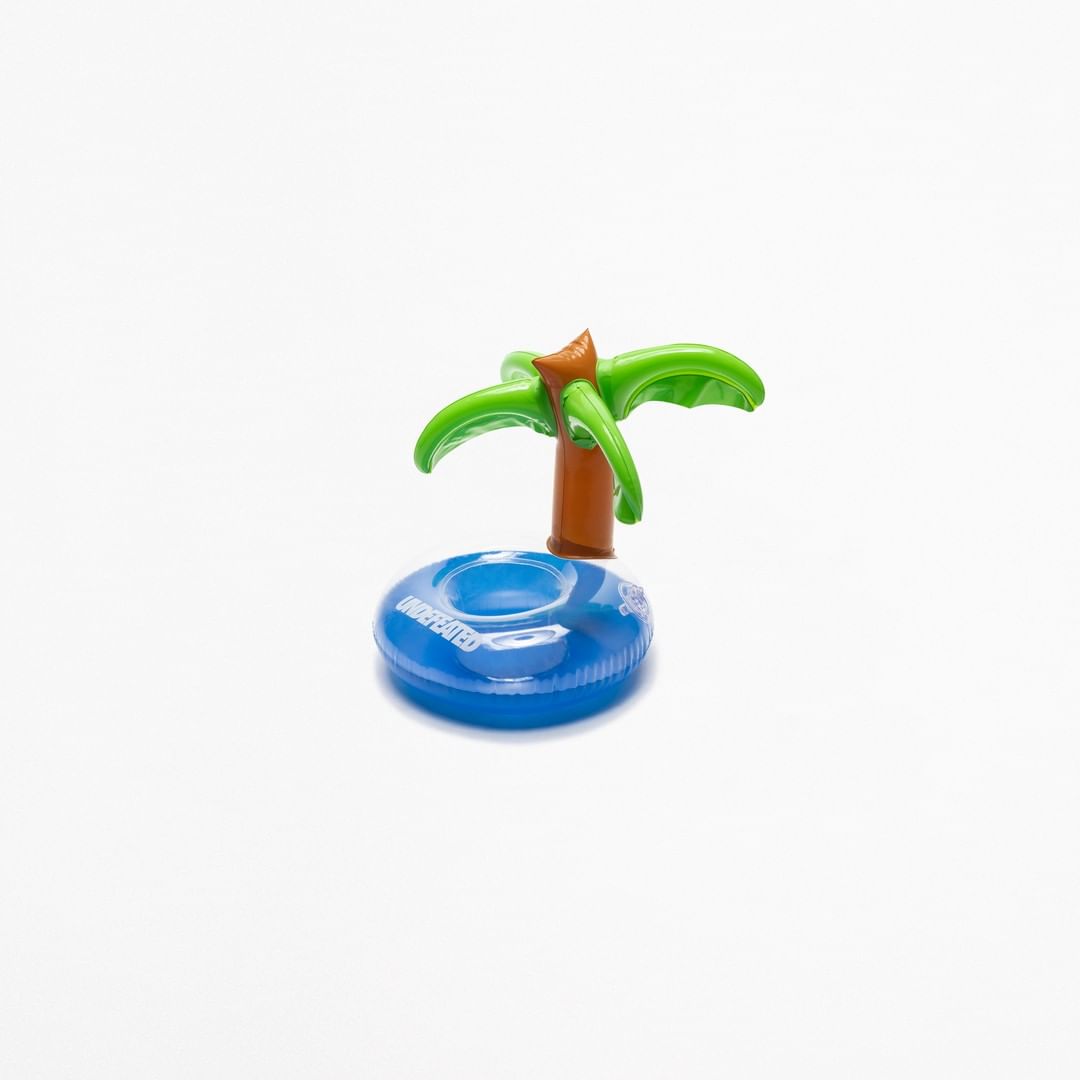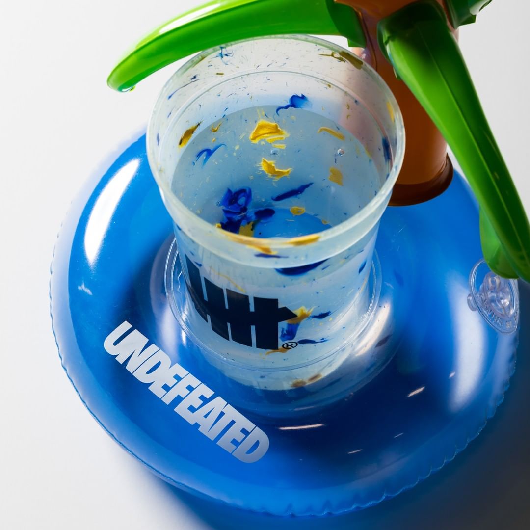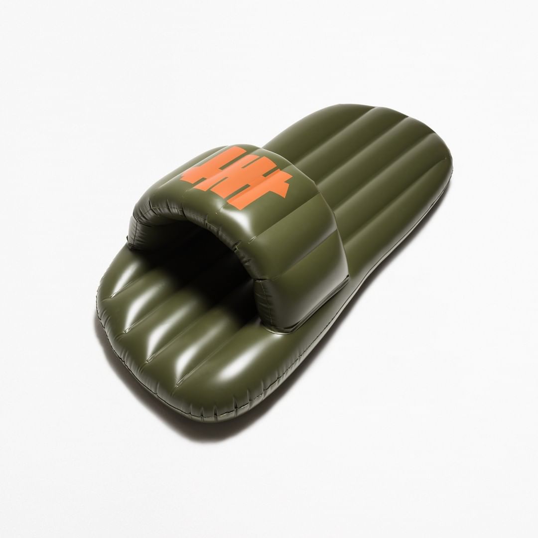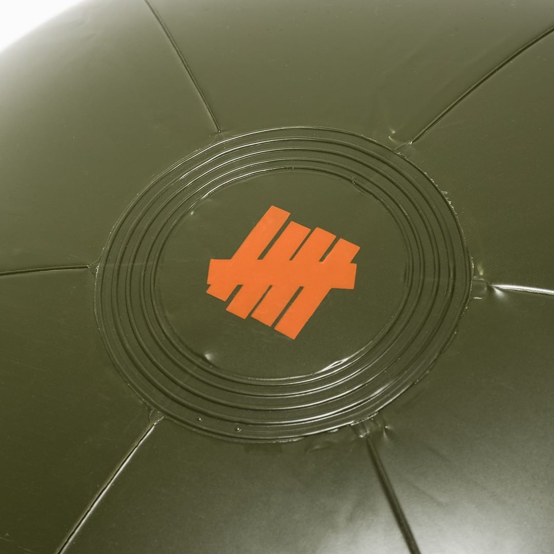 充气沙滩球、拖鞋形状的气垫床、均已 UNDEFEATED 标志性的军绿和橙色呈现。