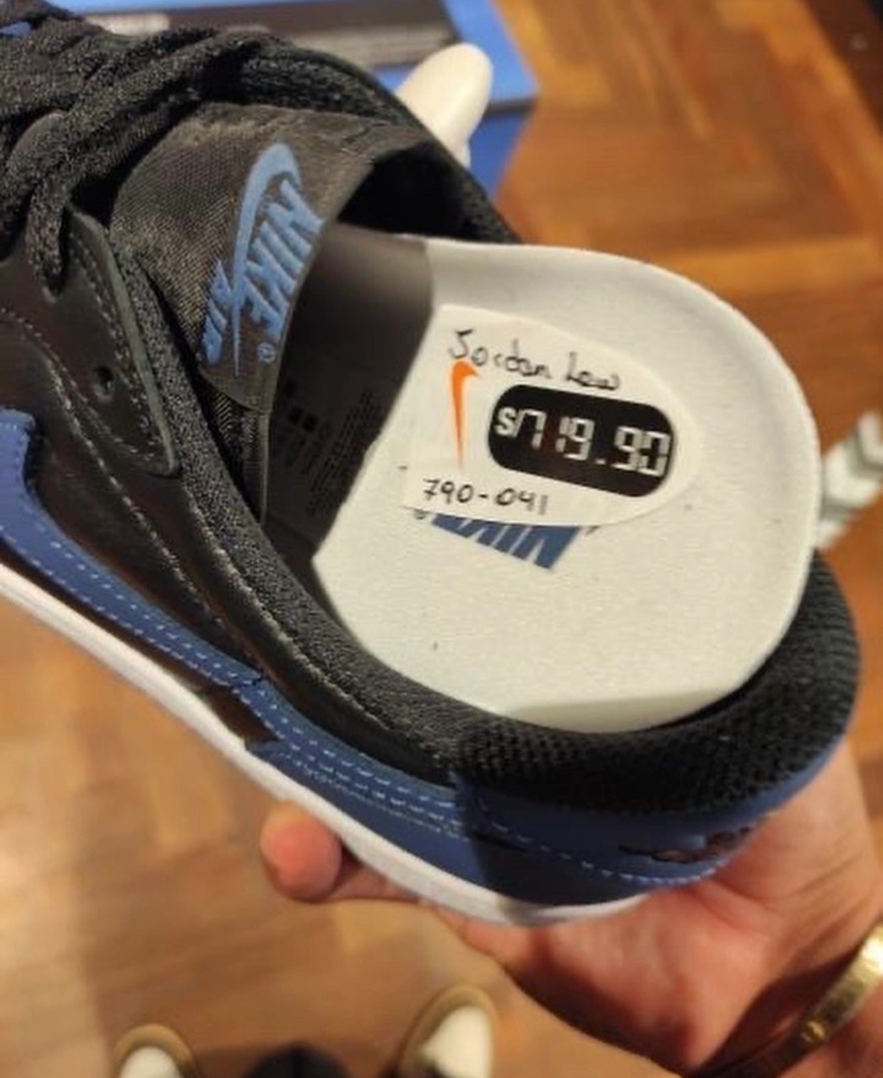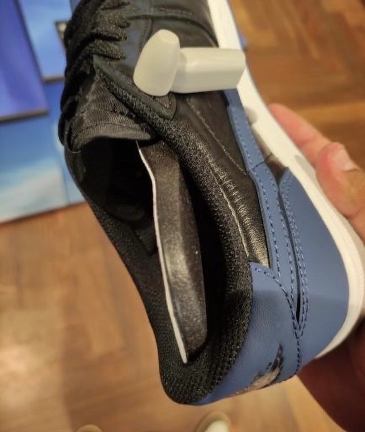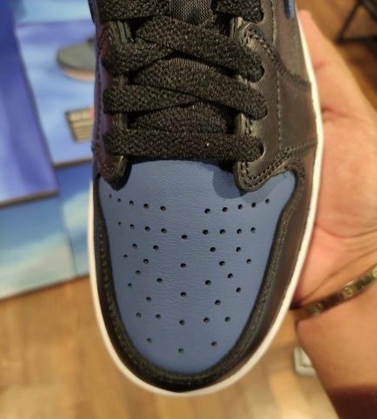 从实物中可以看出,整双鞋以经典的黑蓝配色装扮,鞋面采用光泽度颇高的皮革材质打造,质感方面不用太担心。