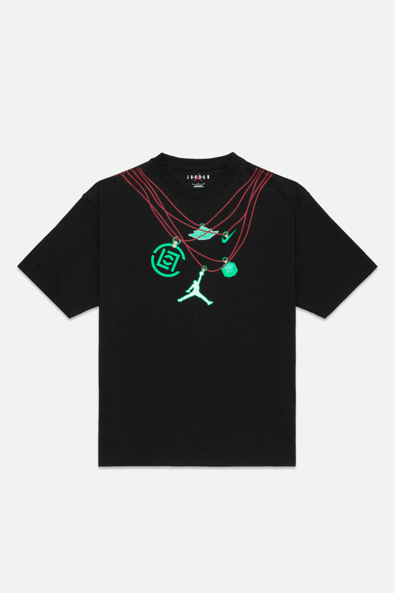 联名黑色 T 恤用胶印图案模仿脖子上戴满的玉石配饰,还巧妙地融入了 CLOT 和 Jumpman Logo,彰显联名身份。