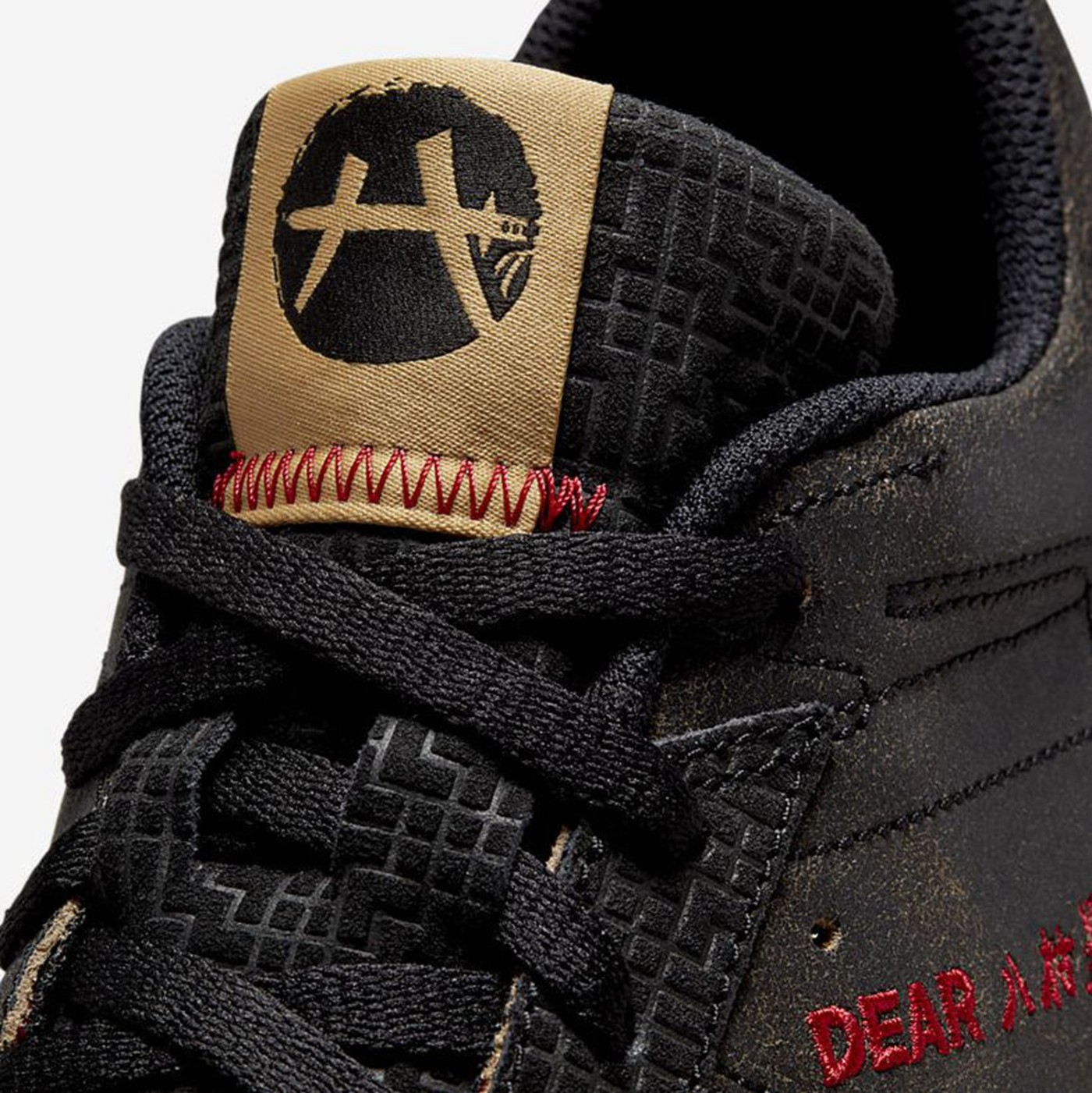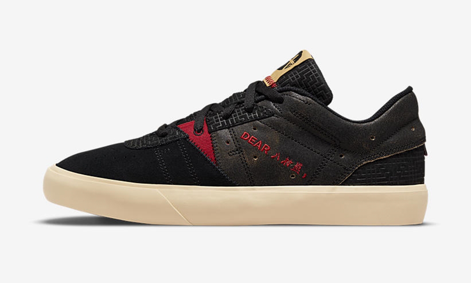 整鞋通体以黑色示人,鞋带扣以及鞋舌辅以红色细节点缀,鞋身外侧还有着 “Dear 八村塁” 的字样,彰显专属身份。