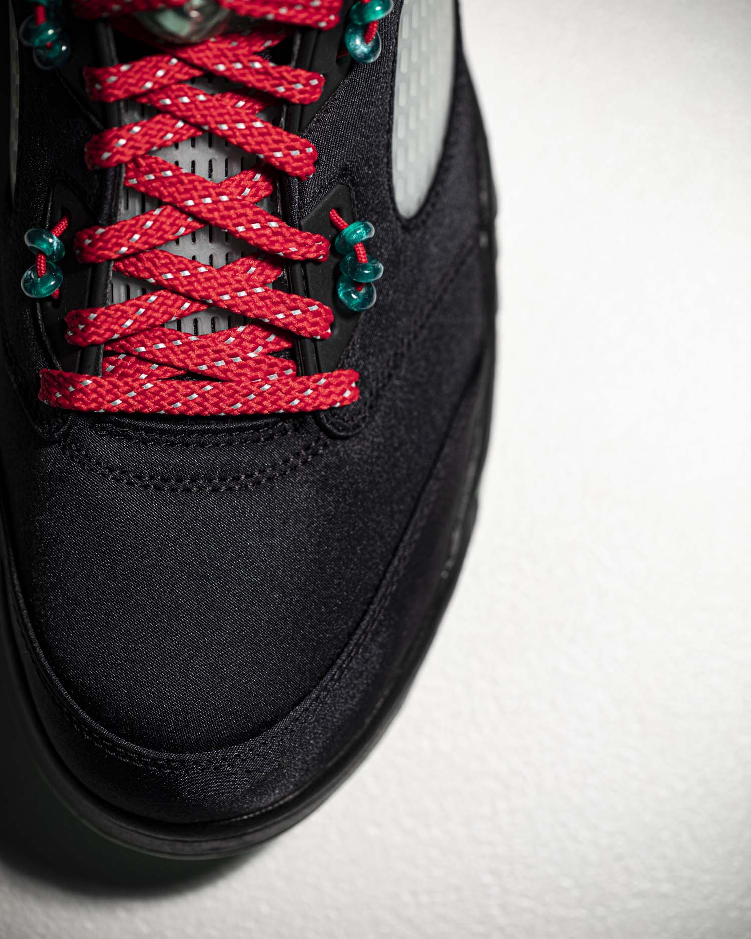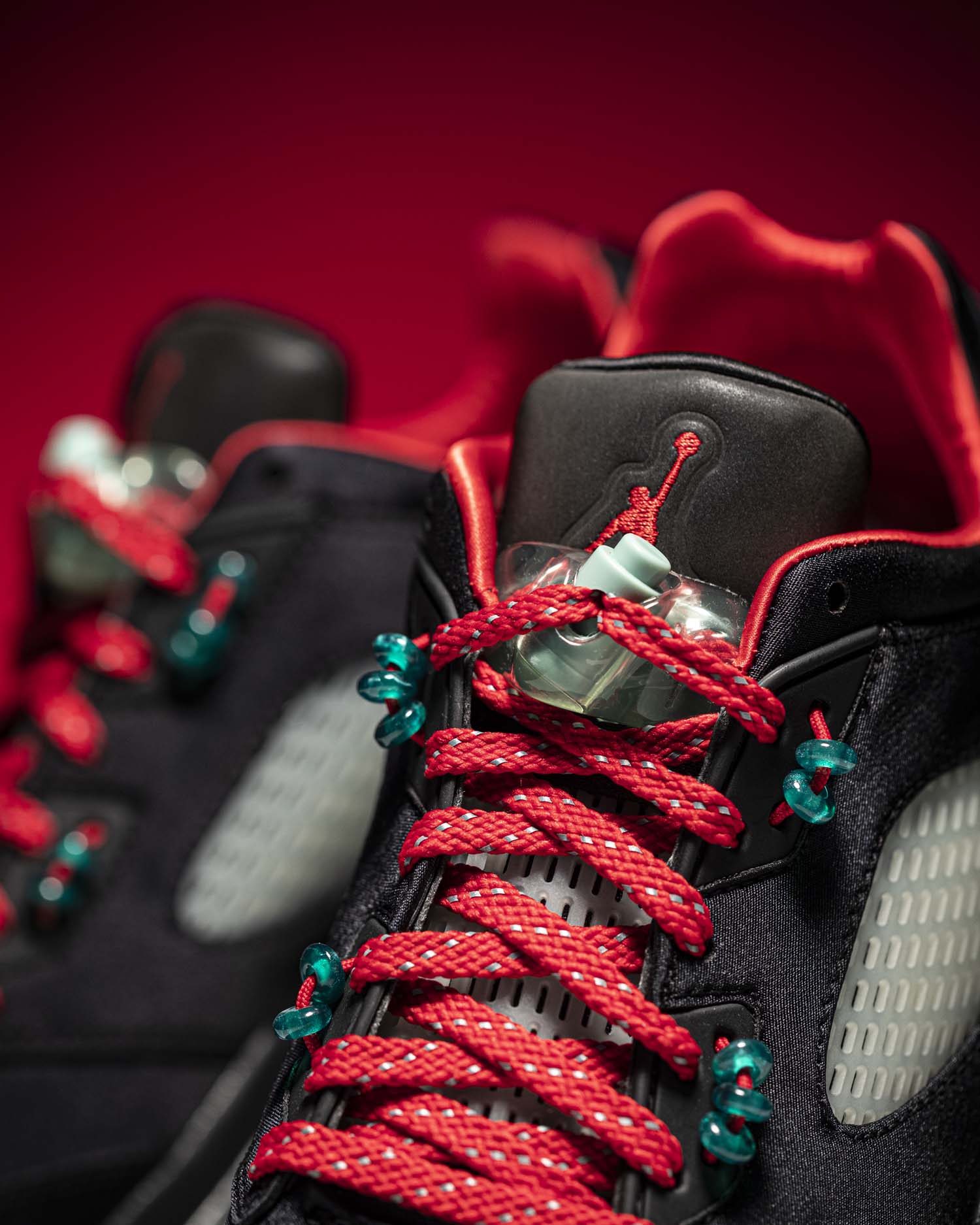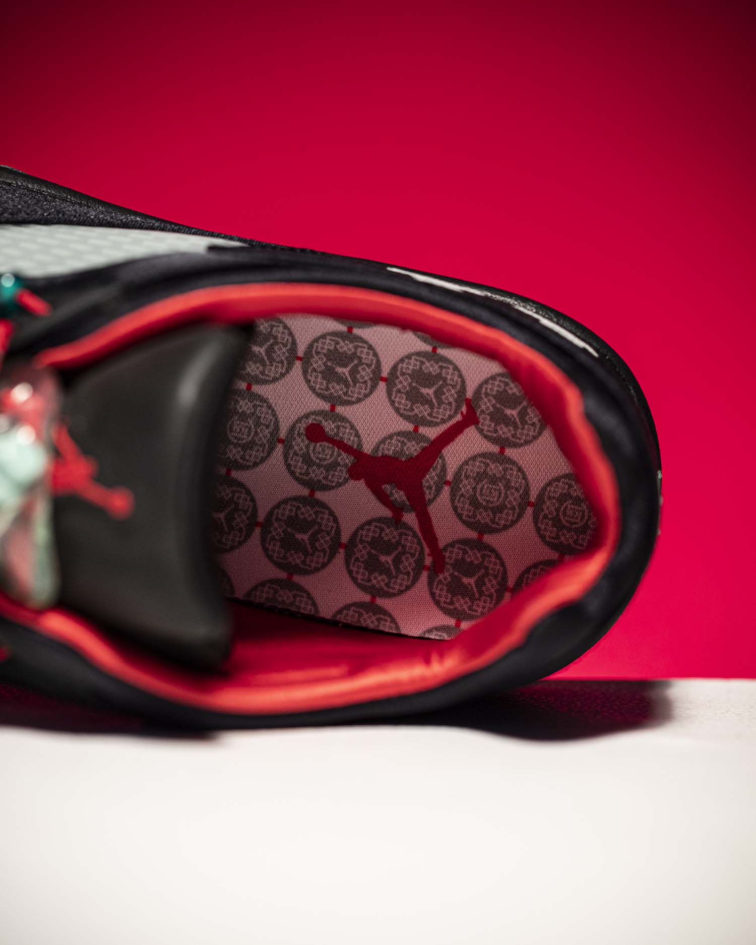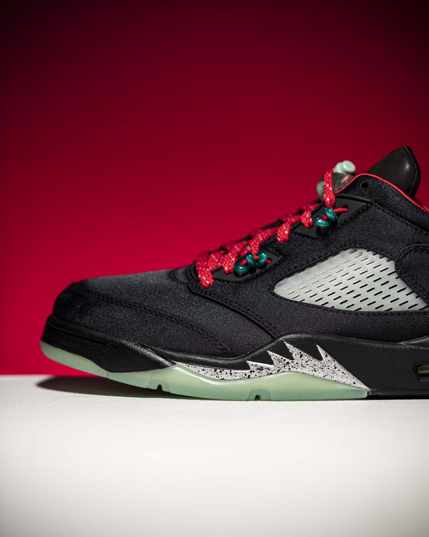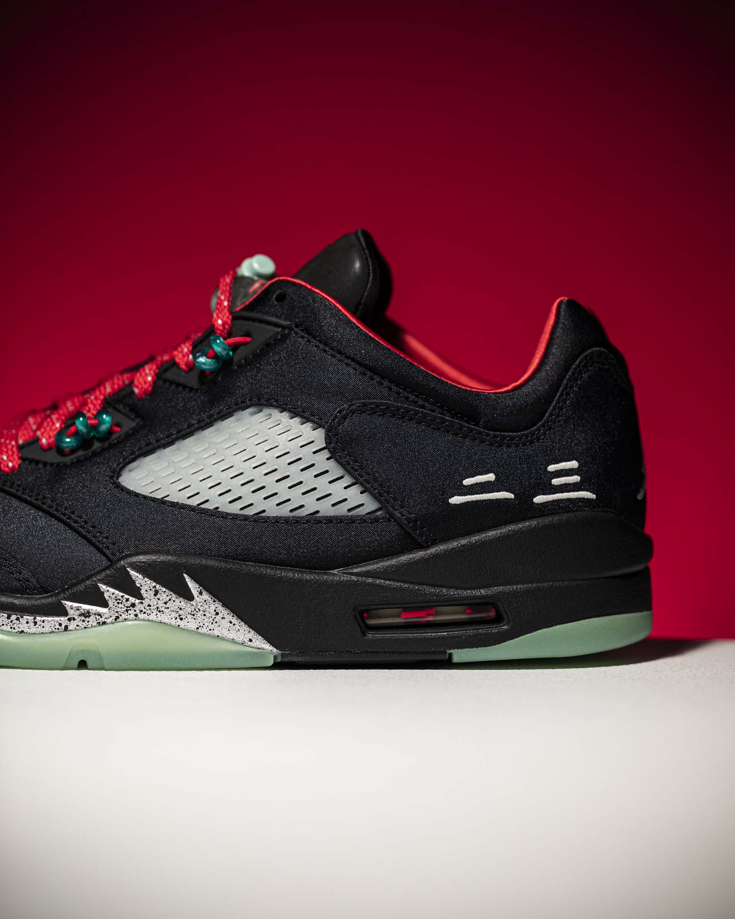经典网孔鞋舌造型,鞋带扣使用玉佩样式的配饰,Air Jordan 5 标志性的大鞋带扣采用半透明设计,更显玉器质感。