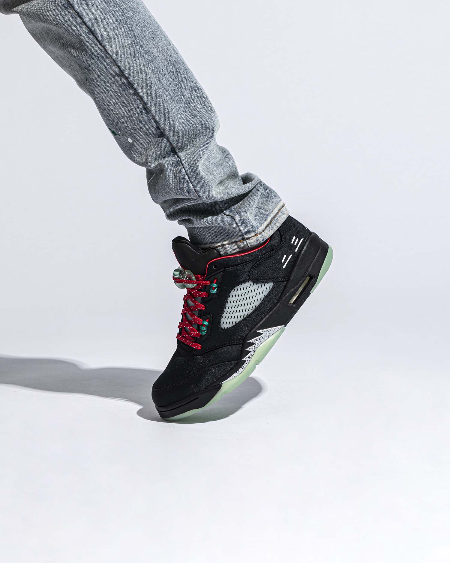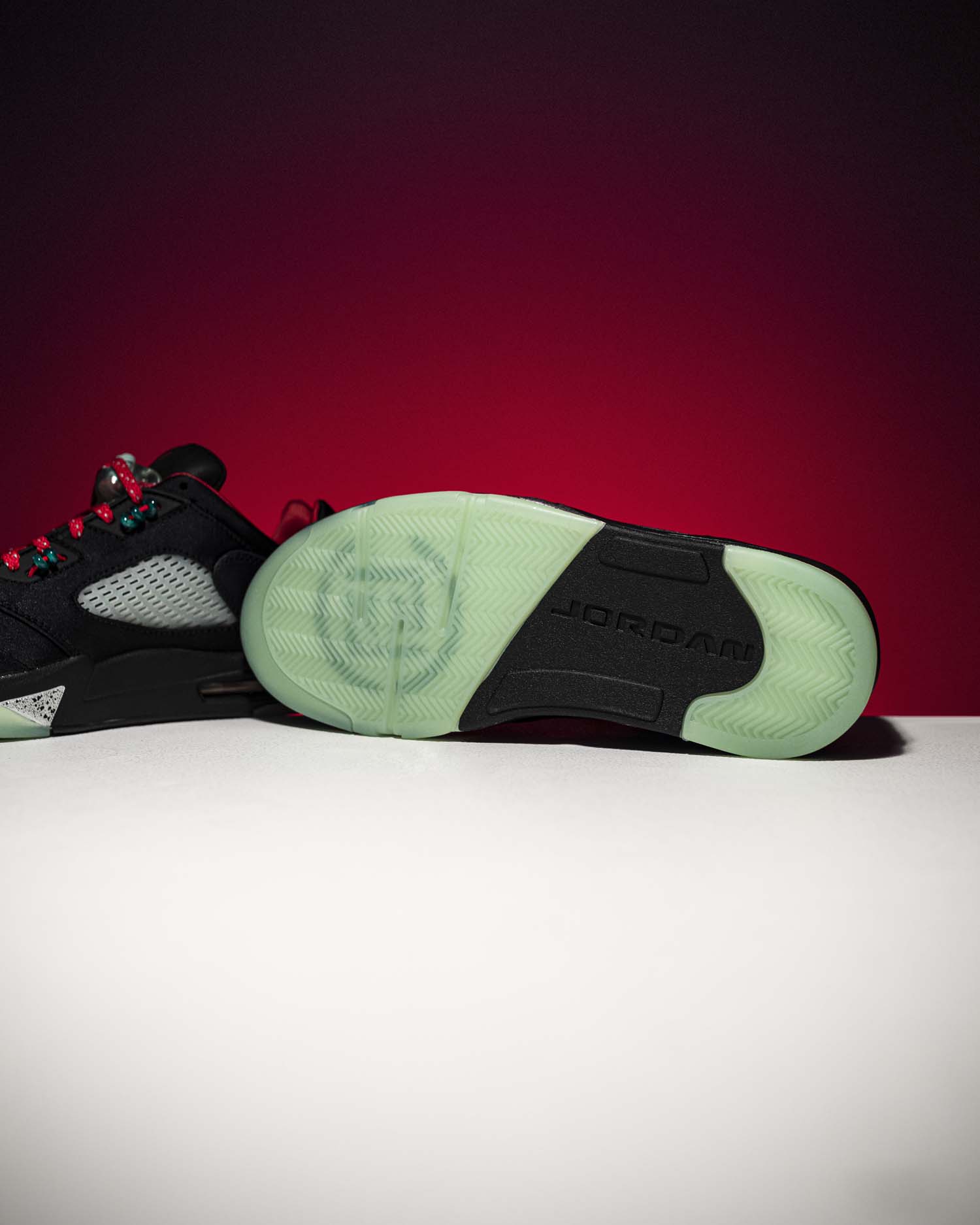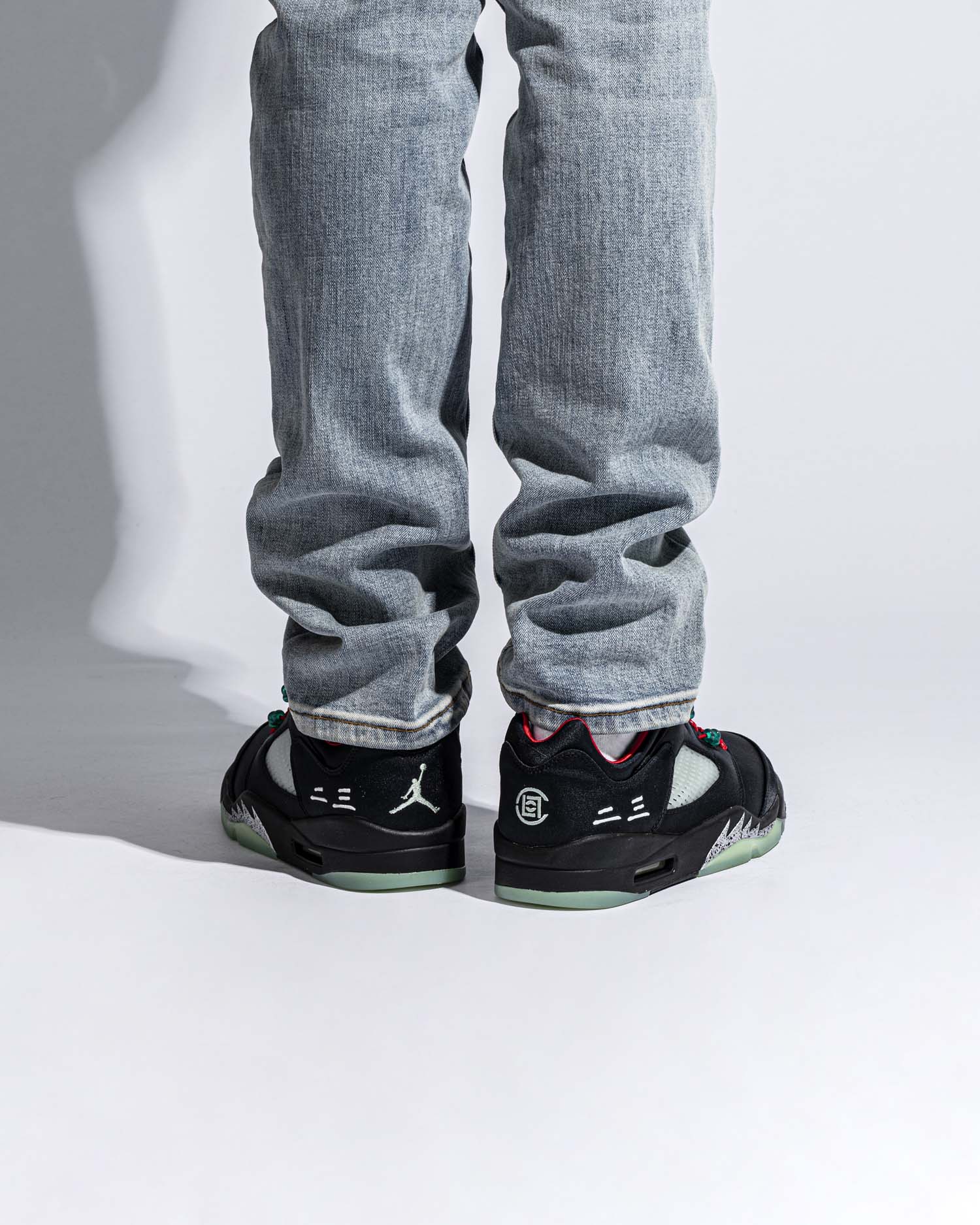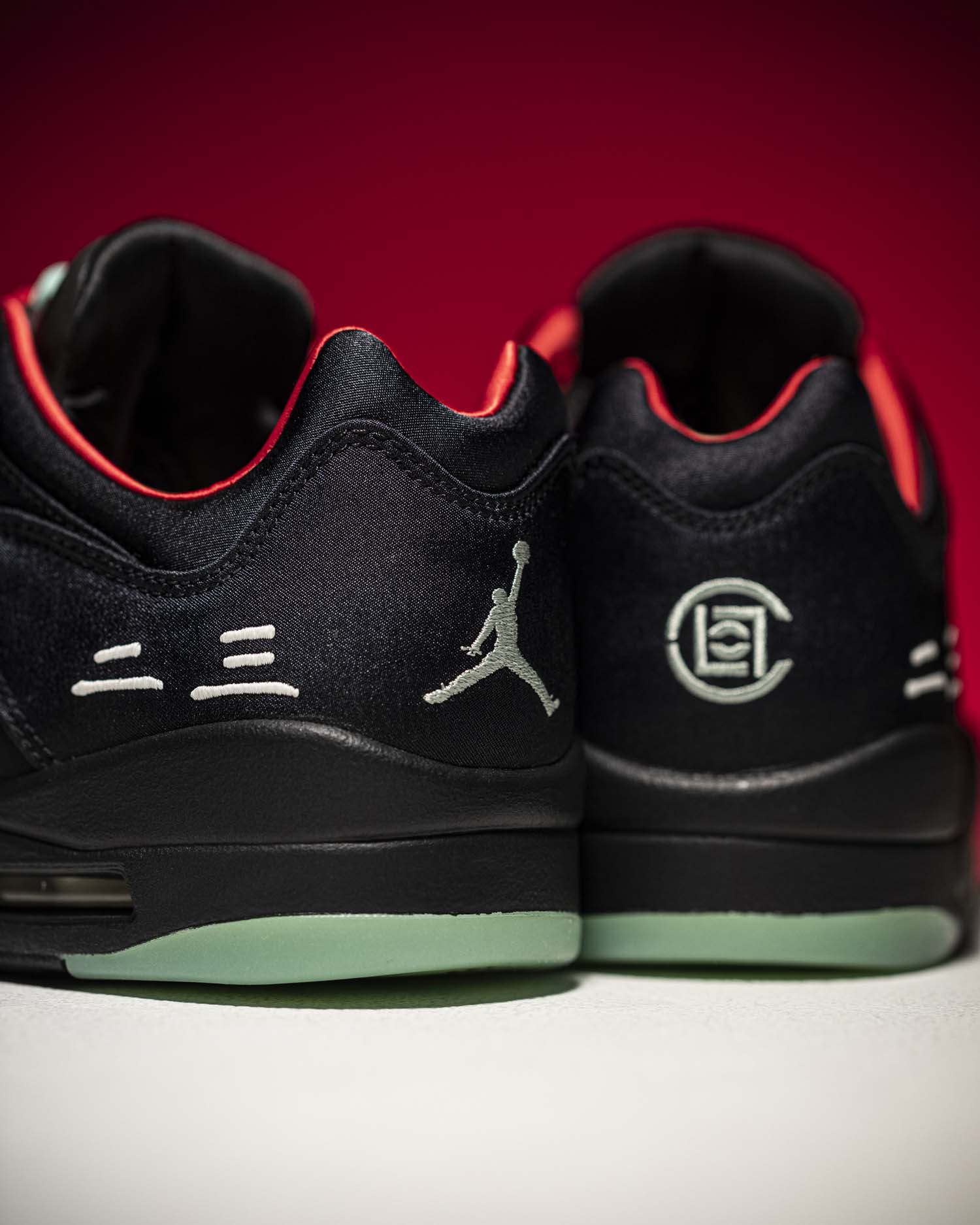 后跟的 Jumpman 以及 CLOT 的刺绣实在太吸睛,夜晚出街鞋底散发幽幽的绿光映射在银色刺绣上,想想就帅。