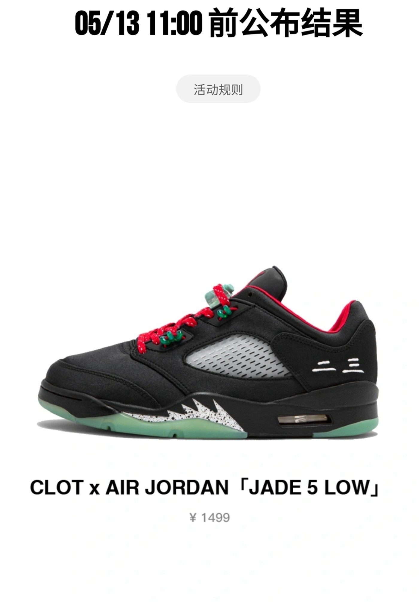 最后是大家关心的发售信息,全新 CLOT x Air Jordan「JADE 5 LOW」已于 5 月 10 日在 JUICE RAFFLE 微信小程序开始登记,今天中午十二点登记已经截止,线上支付通道从明天上午十点开启截止到晚九点,发售价格为 ¥1499 元,中签的朋友千万不要忘记去支付。