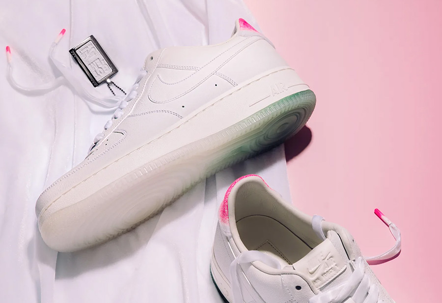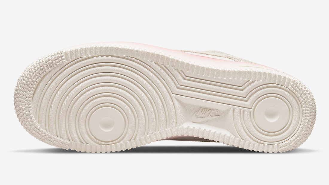 要说整双鞋最吸引人的部分,当属中底的粉色晕染渐变,印象中上一次见到 Air Force 1 上的类似设计,还是 Air Force 1「桃」的后跟部分。