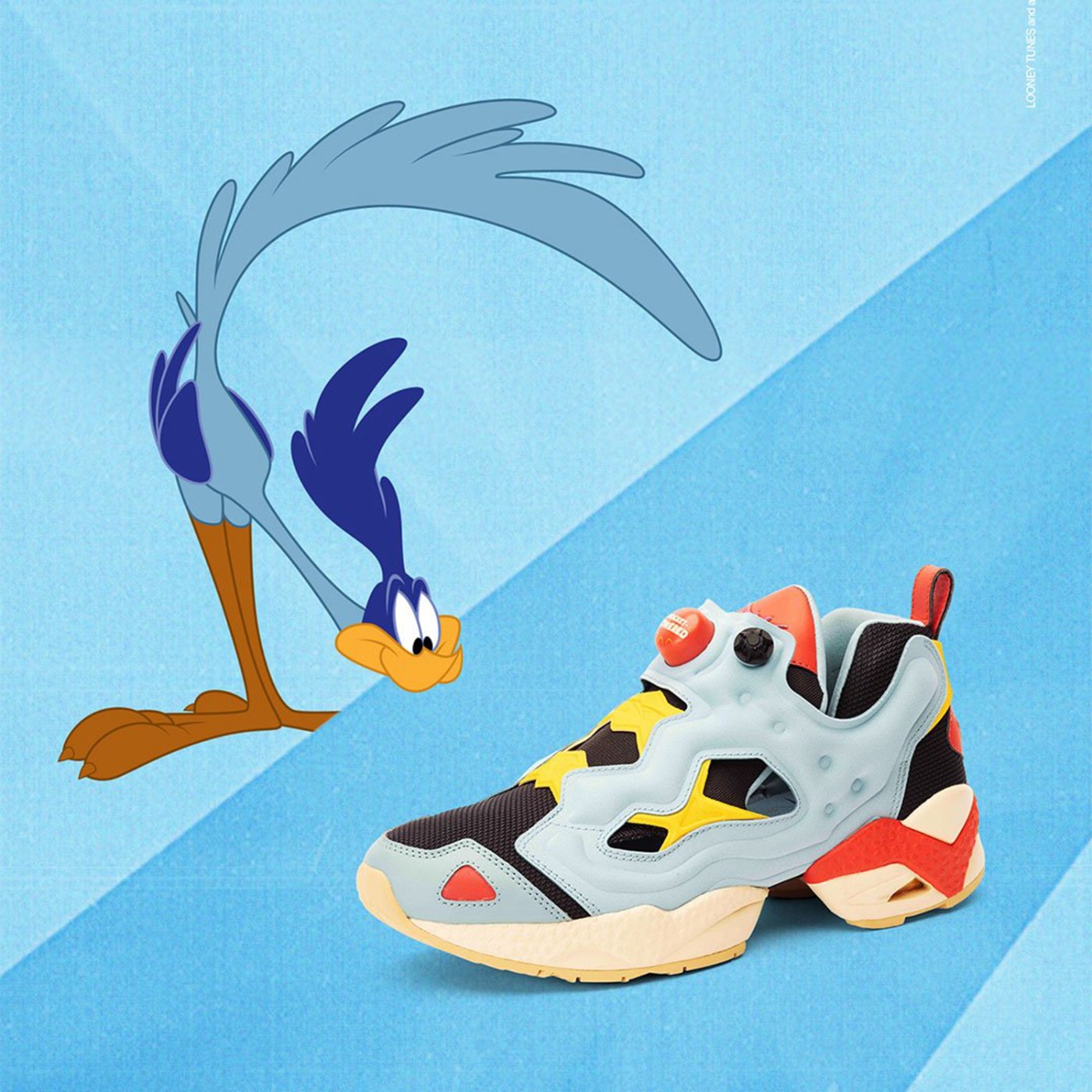 Reebok Instapump Fury 95 这款鞋设计灵感来自于哔哔鸟,鞋面整体以蓝色为主也和哔哔鸟身上蓝色羽毛颜色相同。