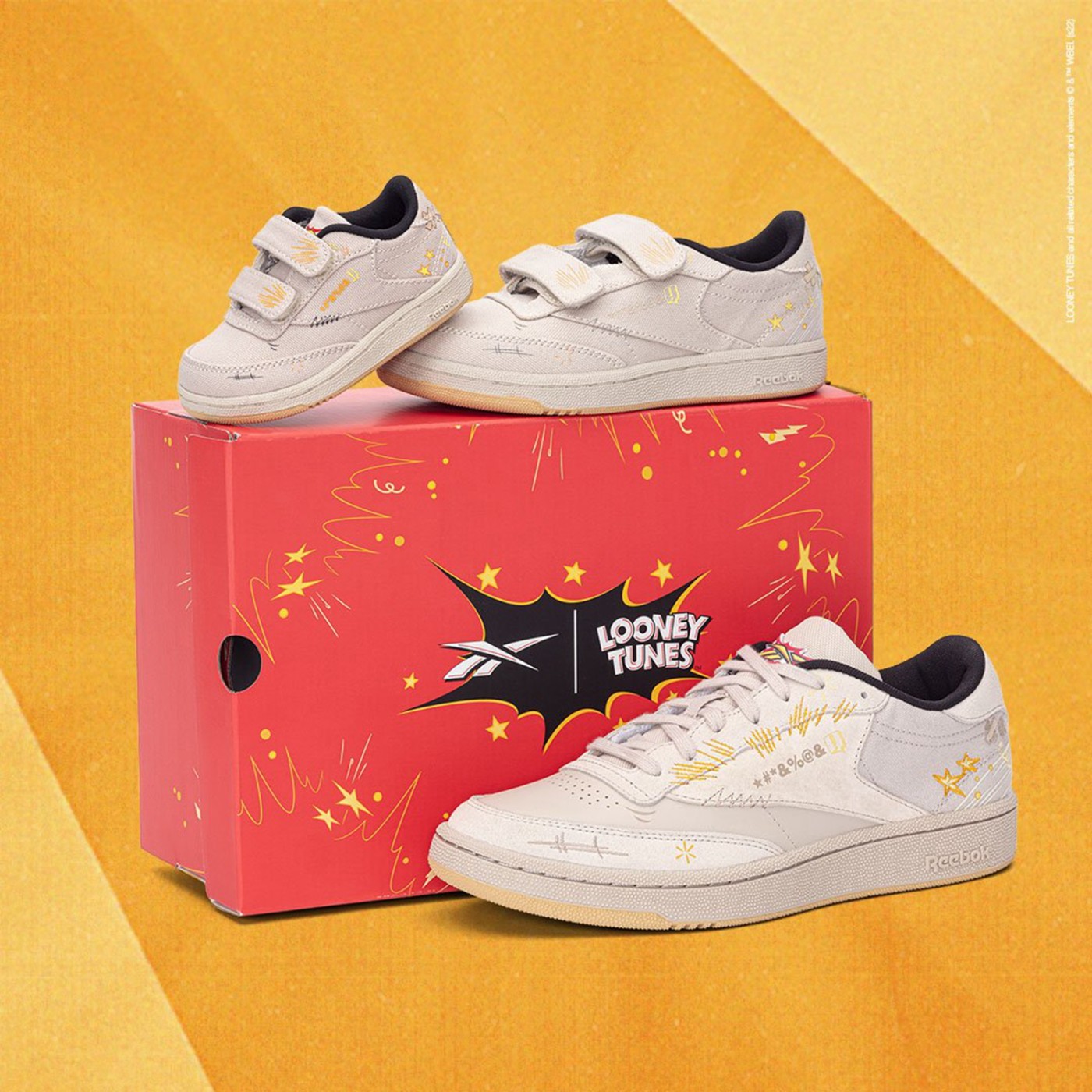 最后这双 Reebok Club C 将《兔八哥》中出现的角色以及道具都致敬个遍,鞋舌上硕大的 Logo,还有鞋身上的图案都说明了设计灵感来自于哪。