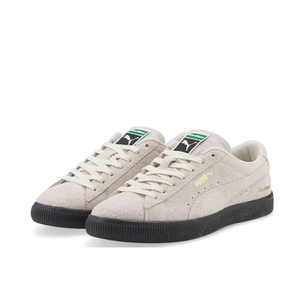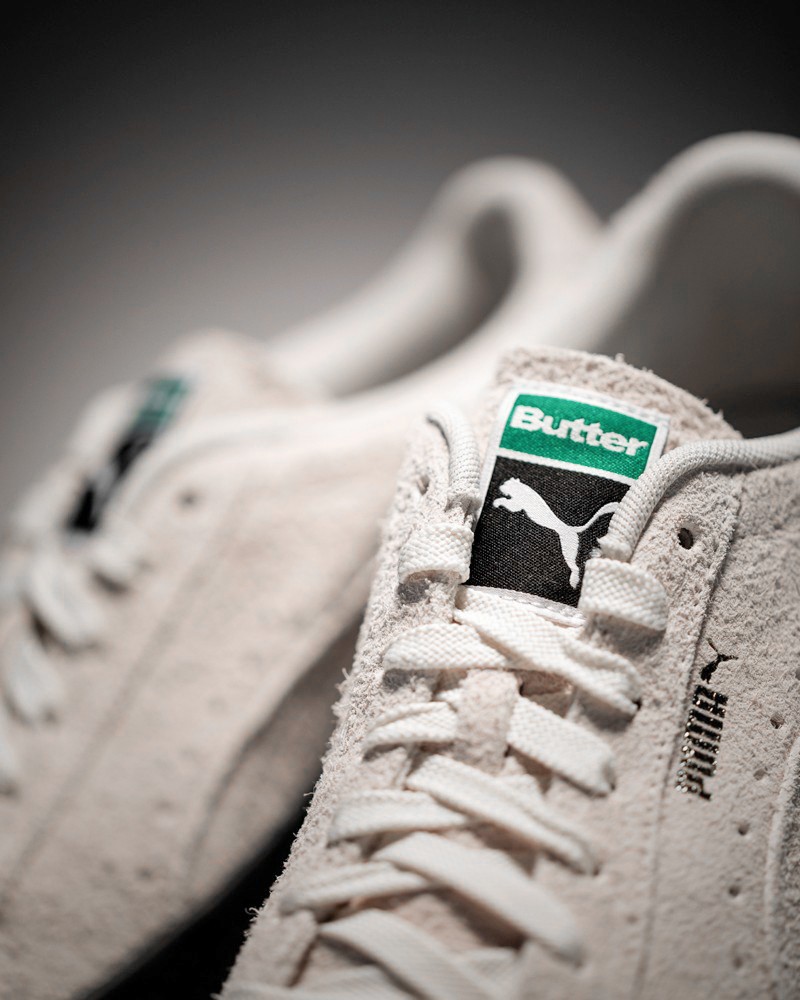 鞋舌美洲狮 Logo 上方的 PUMA 字样被 Butter 替代,彰显联名身份,绿色鞋舌标签带来亮眼细节。