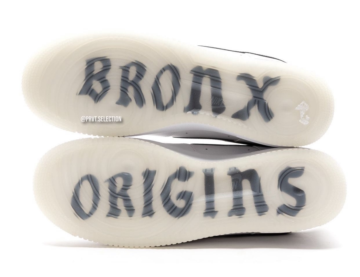 最大的亮点在于外底,奶白色半透明水晶大底内部写有硕大的 Bronx 和 Origins,致敬布朗克斯的说唱 OG。