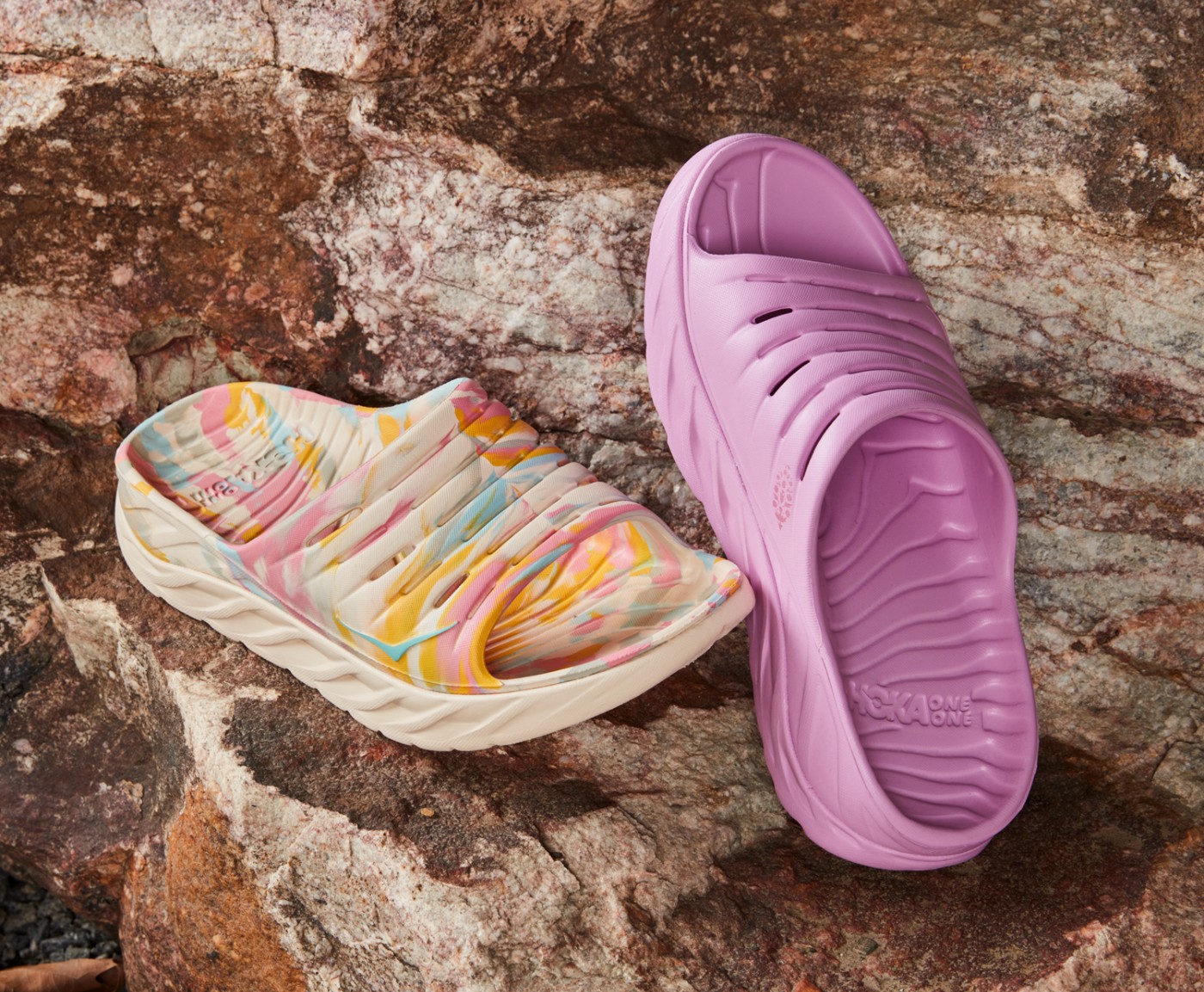 与此同时,HOKA x FP Movement ORA Slide 拖鞋也推出两款配色,其一以粉紫色覆盖鞋身,另一款则以缤纷大理石纹路为设计元素。
