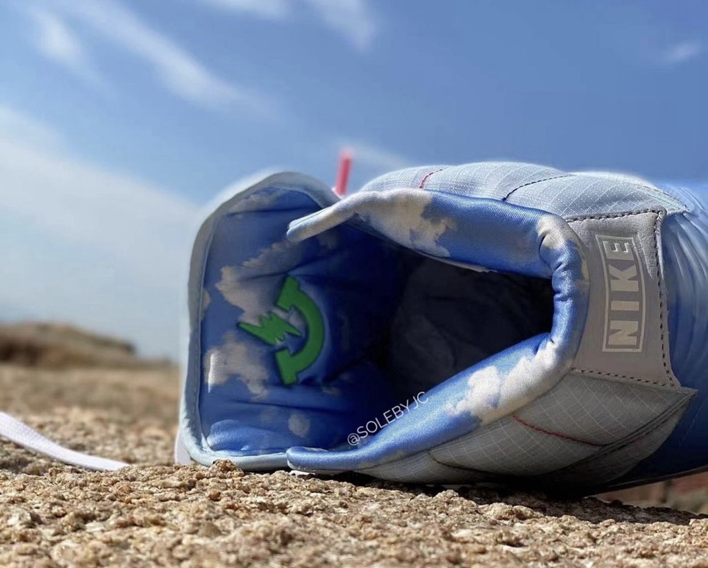 后跟部位的 TPU 上以及内衬里都有不少云朵的图案,鞋舌还有上醒目的夜光材质飞翼 Logo。