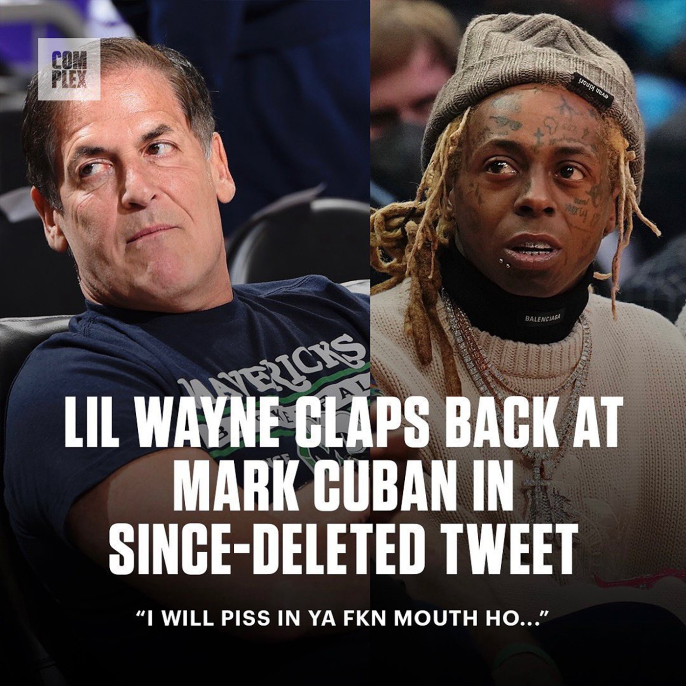 这一举动显然激怒了韦恩,在推上爆粗回应库班:I will piss in ya fkn mouth ho (我要尿你一嘴),不过很快就将这条推删除了。