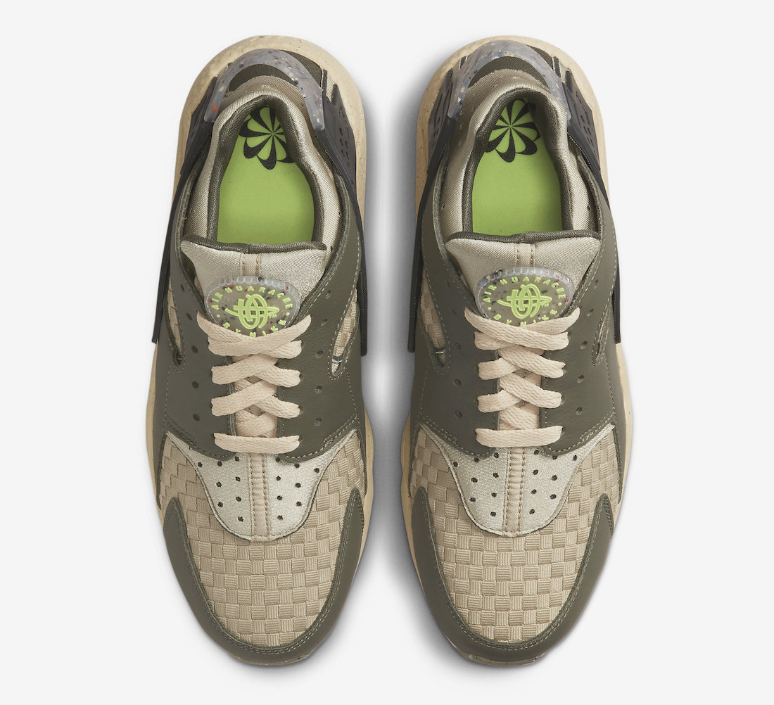 作为整双鞋的亮色点缀,鞋舌上荧光绿色的 Air Huarache 标牌,呼应鞋垫上的同色 Move to Zero 风车图案。