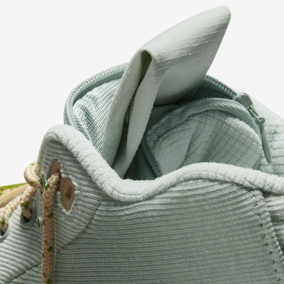 鞋型改动方面,融入了 Travis Scott 标志性的「倒钩」、「带兜」设计。