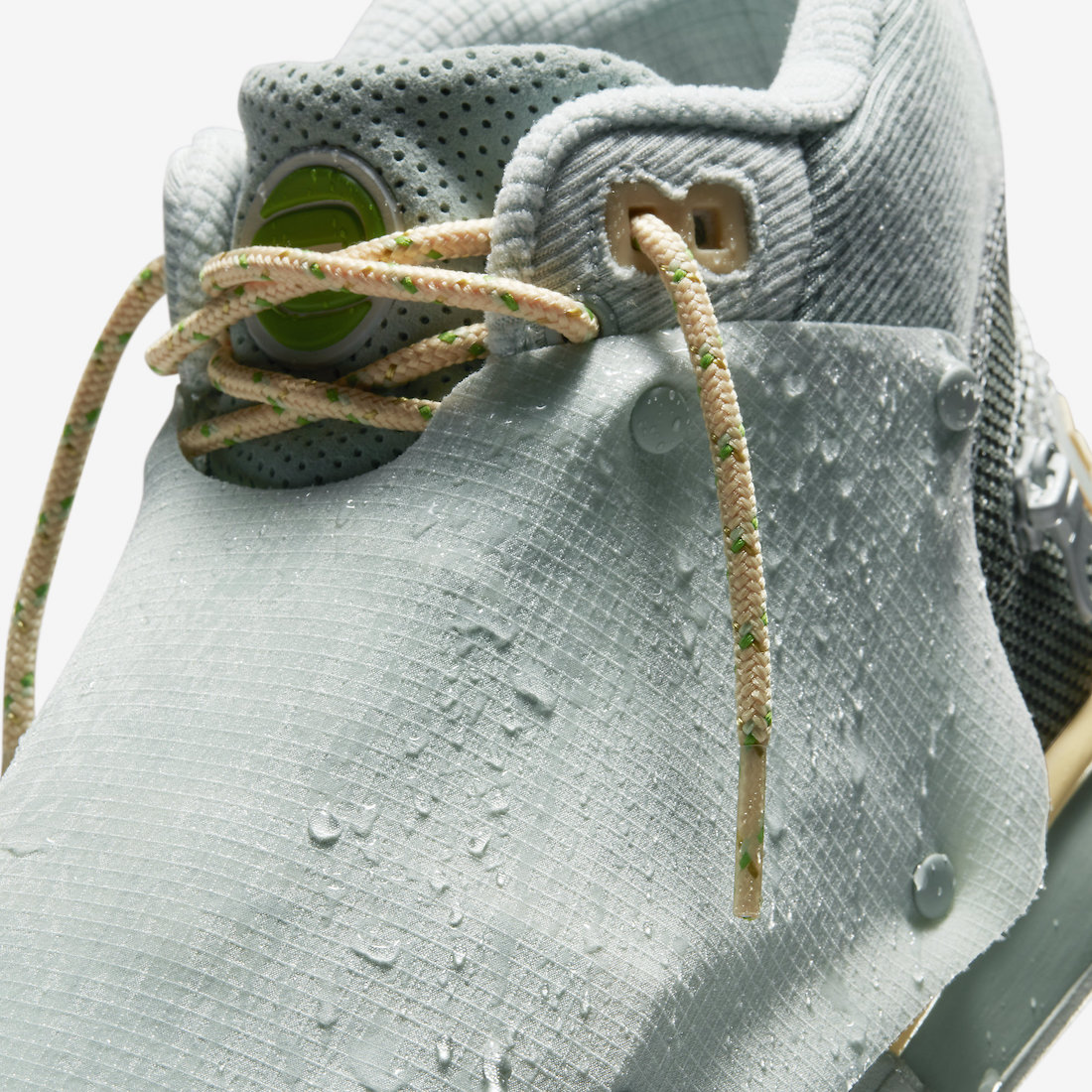 最特别的还是要数全新加入的「面罩」,不需要时面罩收纳于鞋舌顶端拉链内部,需要时取出通过按扣固定在鞋面上,带有特殊涂层的工程网布能够起到防水效果。