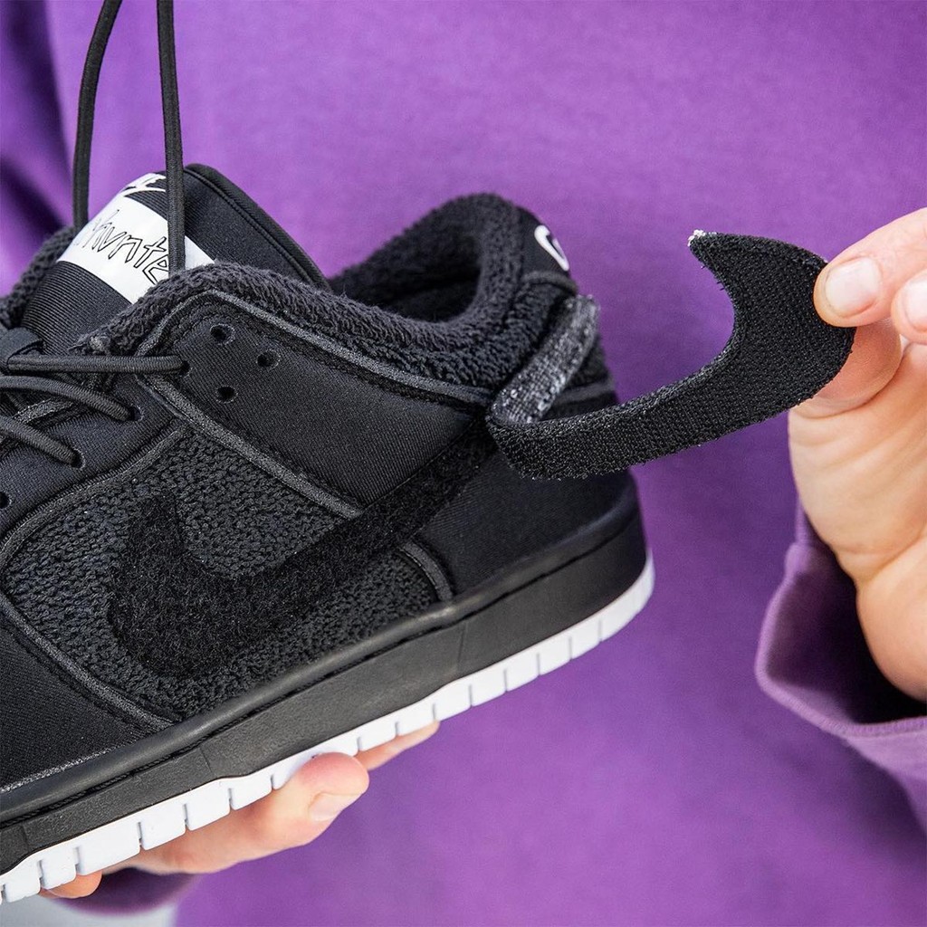上次双方联名还是 2019 年的 Nike SB Zoom Blazer Mid “Gnarhunters”,本次延续熟悉的酷黑装扮,白色外底收尾。
